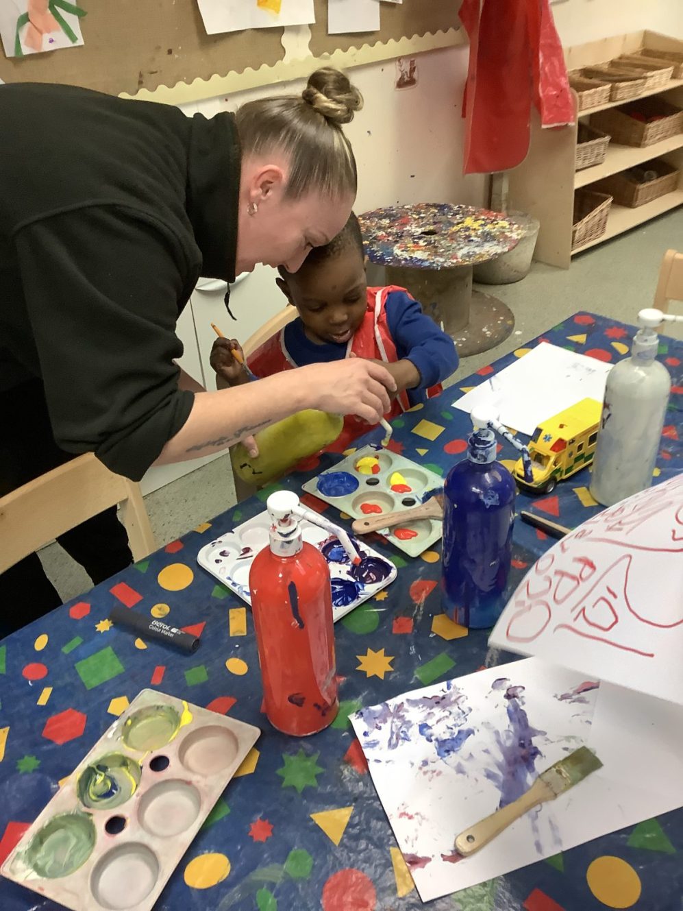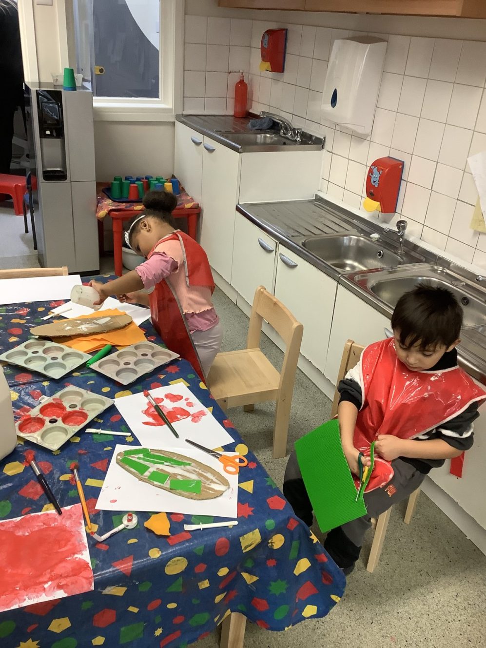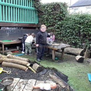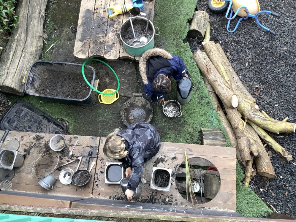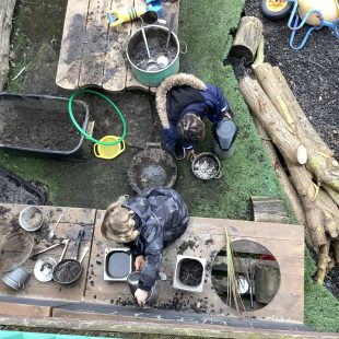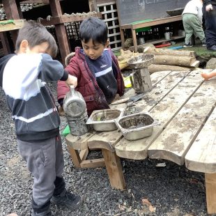 Mild weather has led to some fabulous action in the mud kitchen. Collaboration, precision and exploration in abundance and well worth the mess!  As with all our zones, cross curricular activity is a given; exploring capacity, exploring imaginative scenarios both independently and together, fine and gross motor exercise and story telling…all whilst  developing  language, listening skills  and understanding!