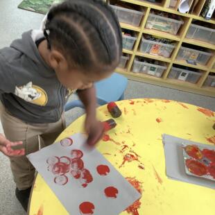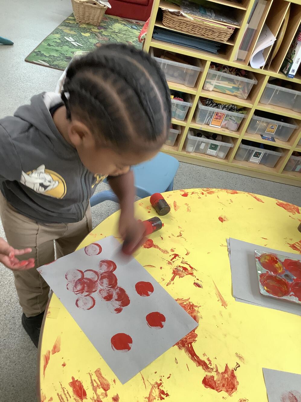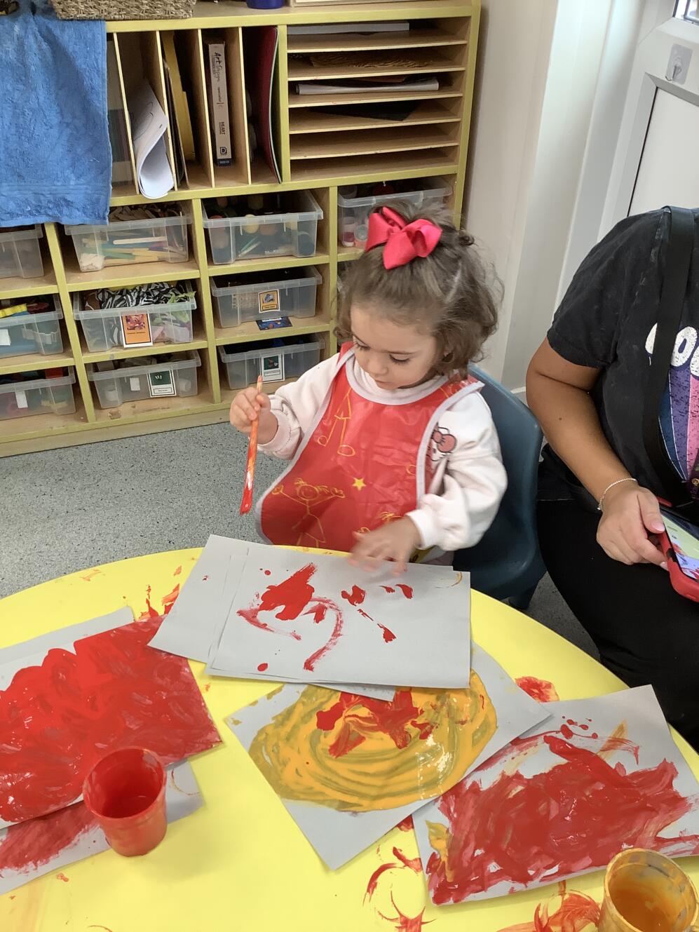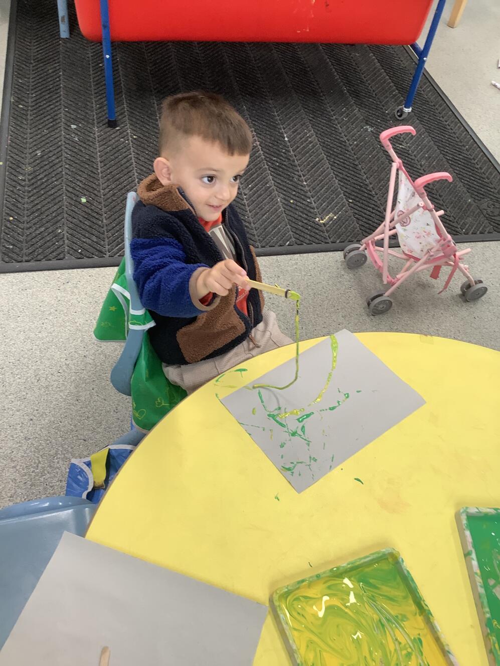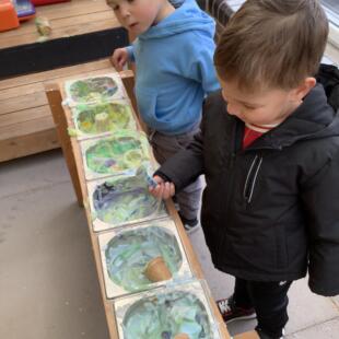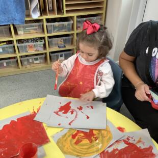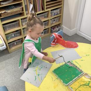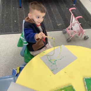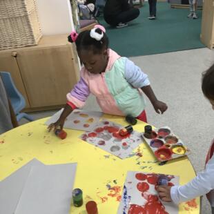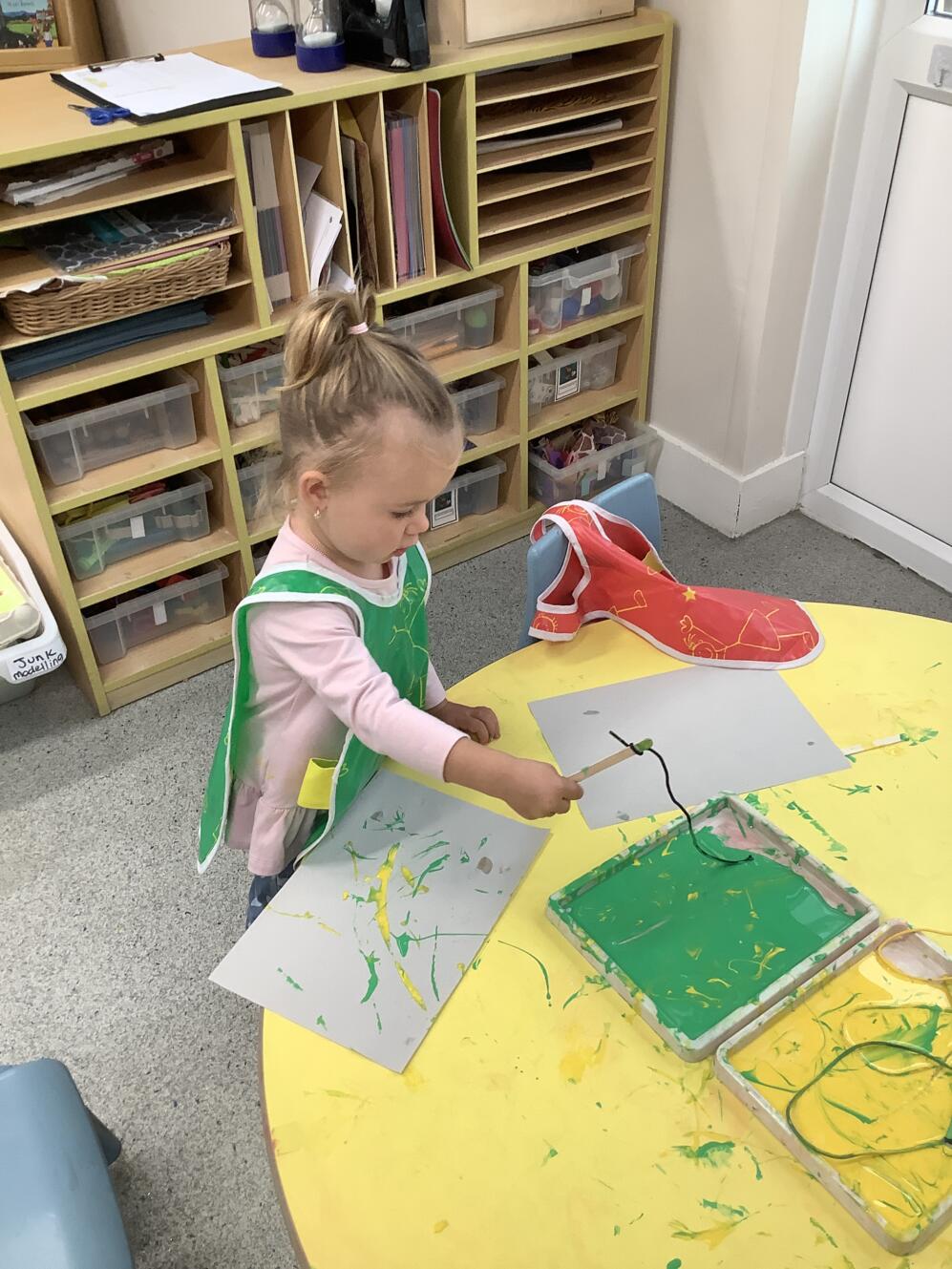 We have been using different tools and prime colours to create works of art. They used their fine motor skills to hold the brushes, sponges and string and dipped and rolled them in the paint, before making their marks on the paper to make a printed pattern. Some children were able to recognise and name the colours they were using, they explored and experimented with mixing the colours together. We talked about the new colours they had made.