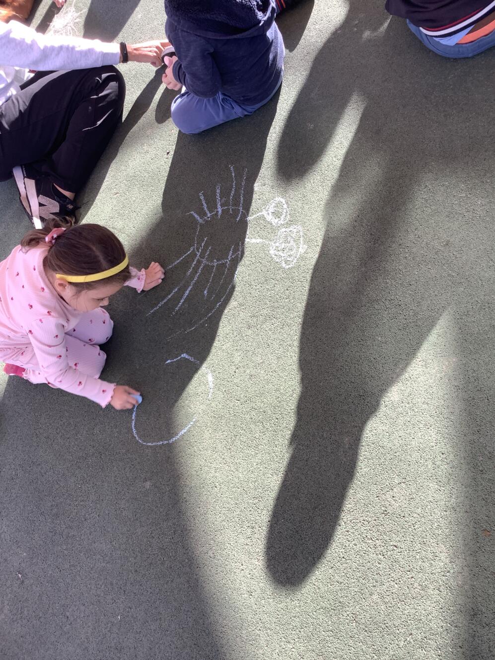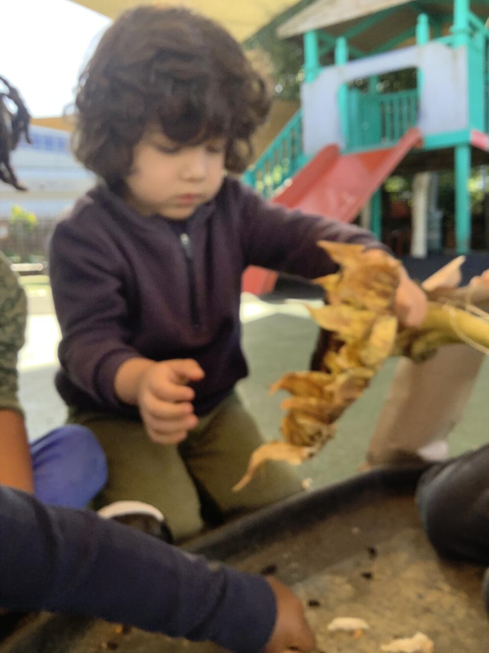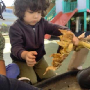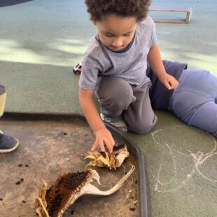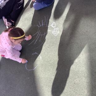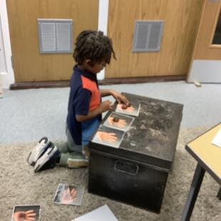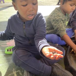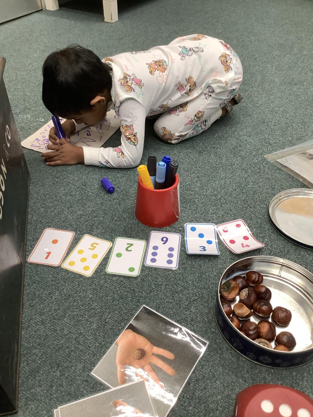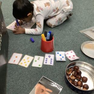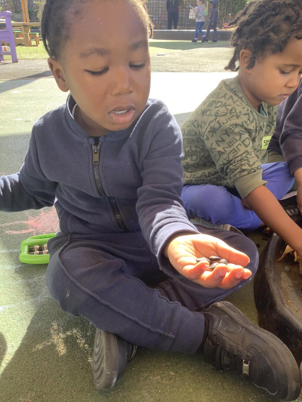Inside the chest, children discovered a collection of photos, a “Father Christmas” tin to open, some numerals and a dice. Whether through shaking, tapping, bouncing or rolling a small collection of conkers was soon discovered. The children were given the time to touch, observe, share and reflect upon their ideas about the items.