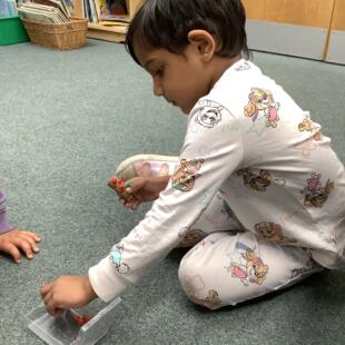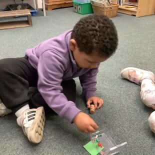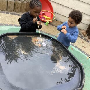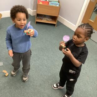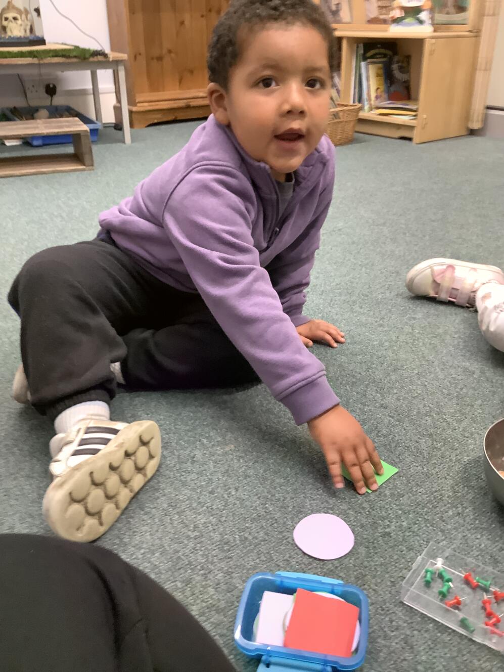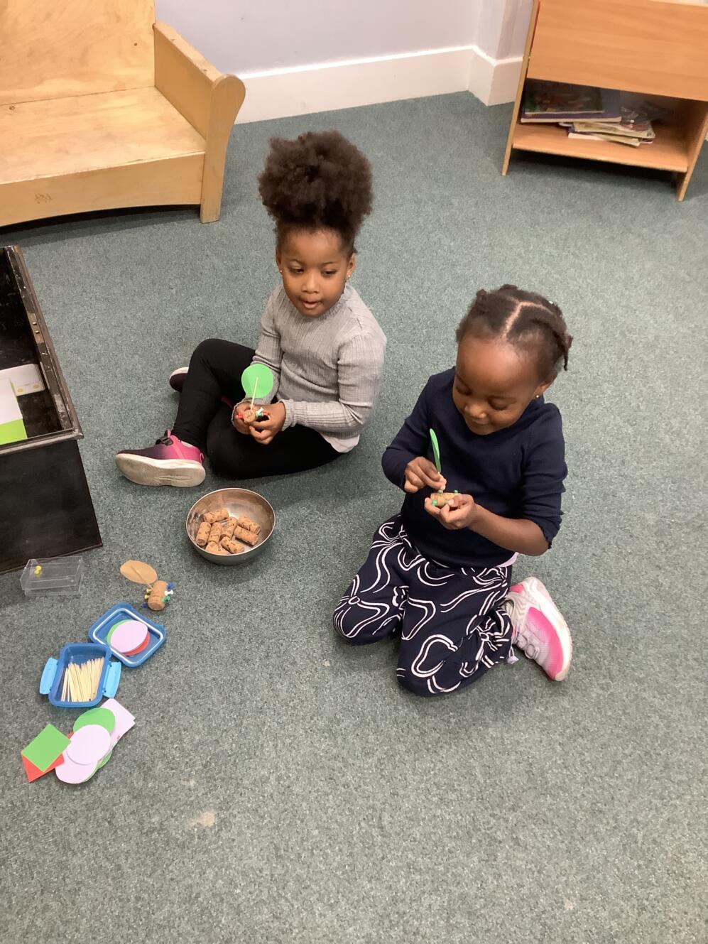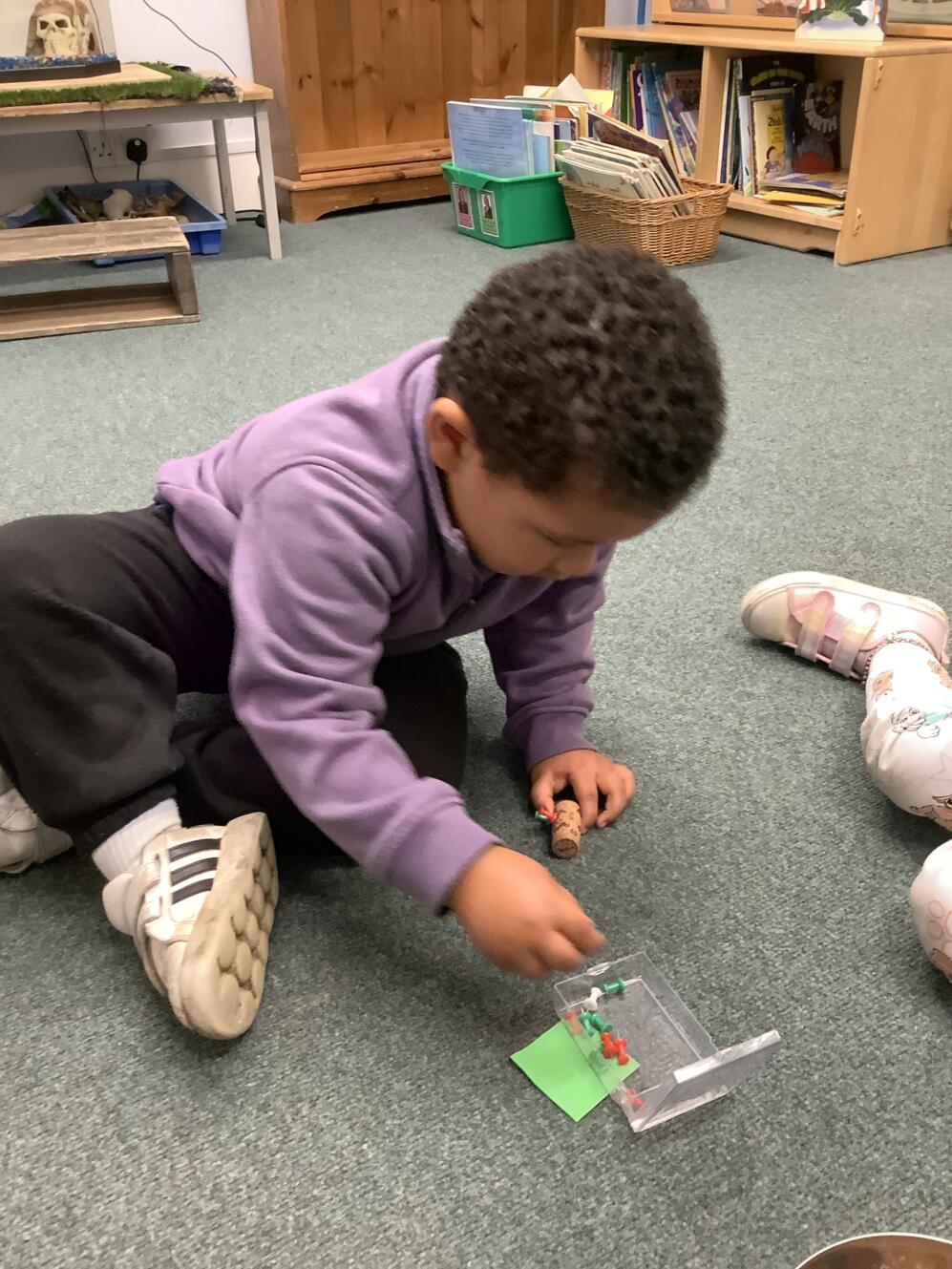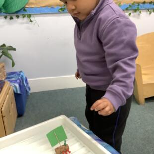 More scientific discovery, number challenges and fine motor eye and muscle work this week; the treasure chest contained a homemade boat! Could the children use the little toy to work out how to make their own? Corks, drawing pins and cocktail sticks were carefully selected and counted before being brought together to form a balanced sail boat.