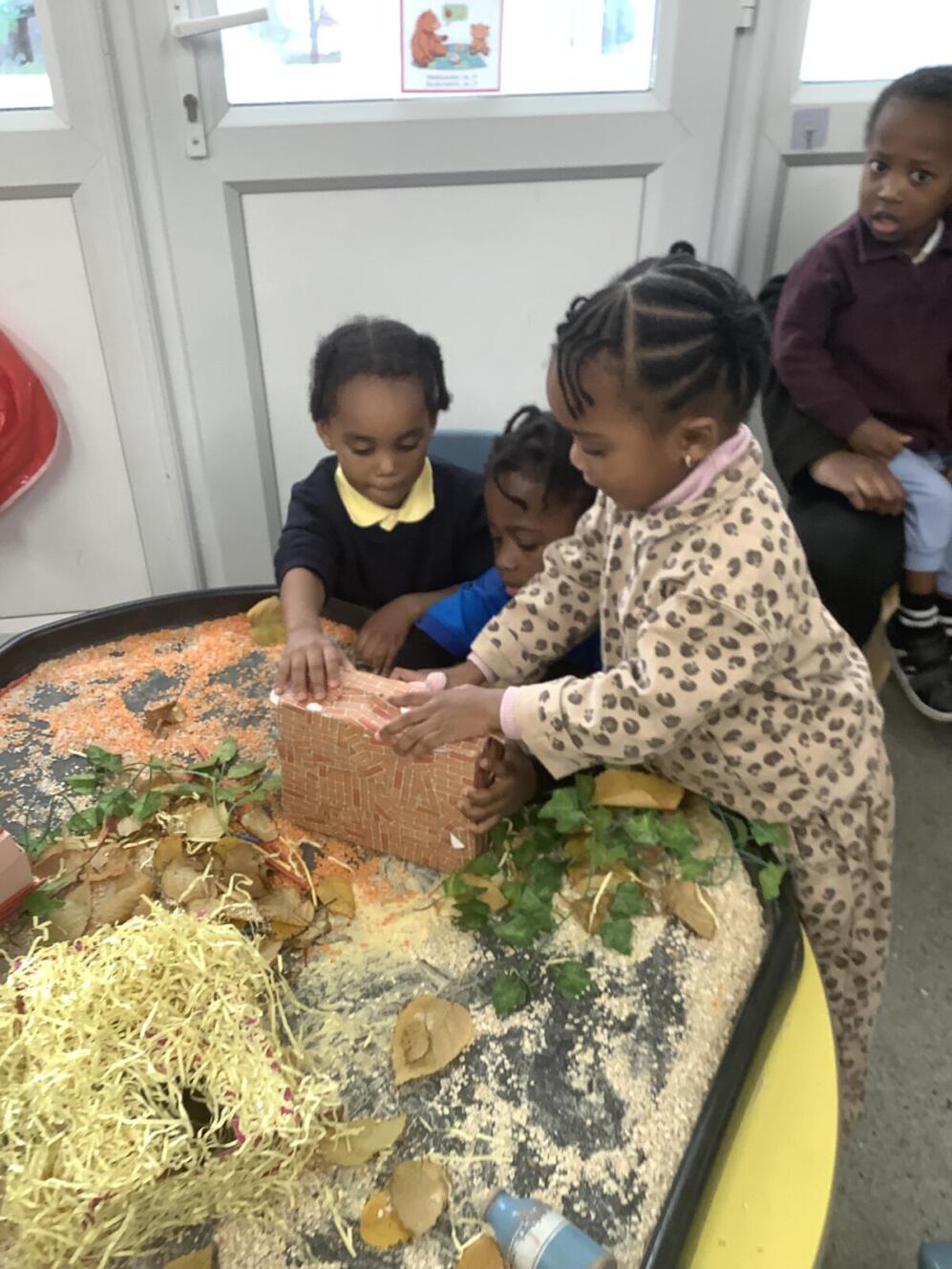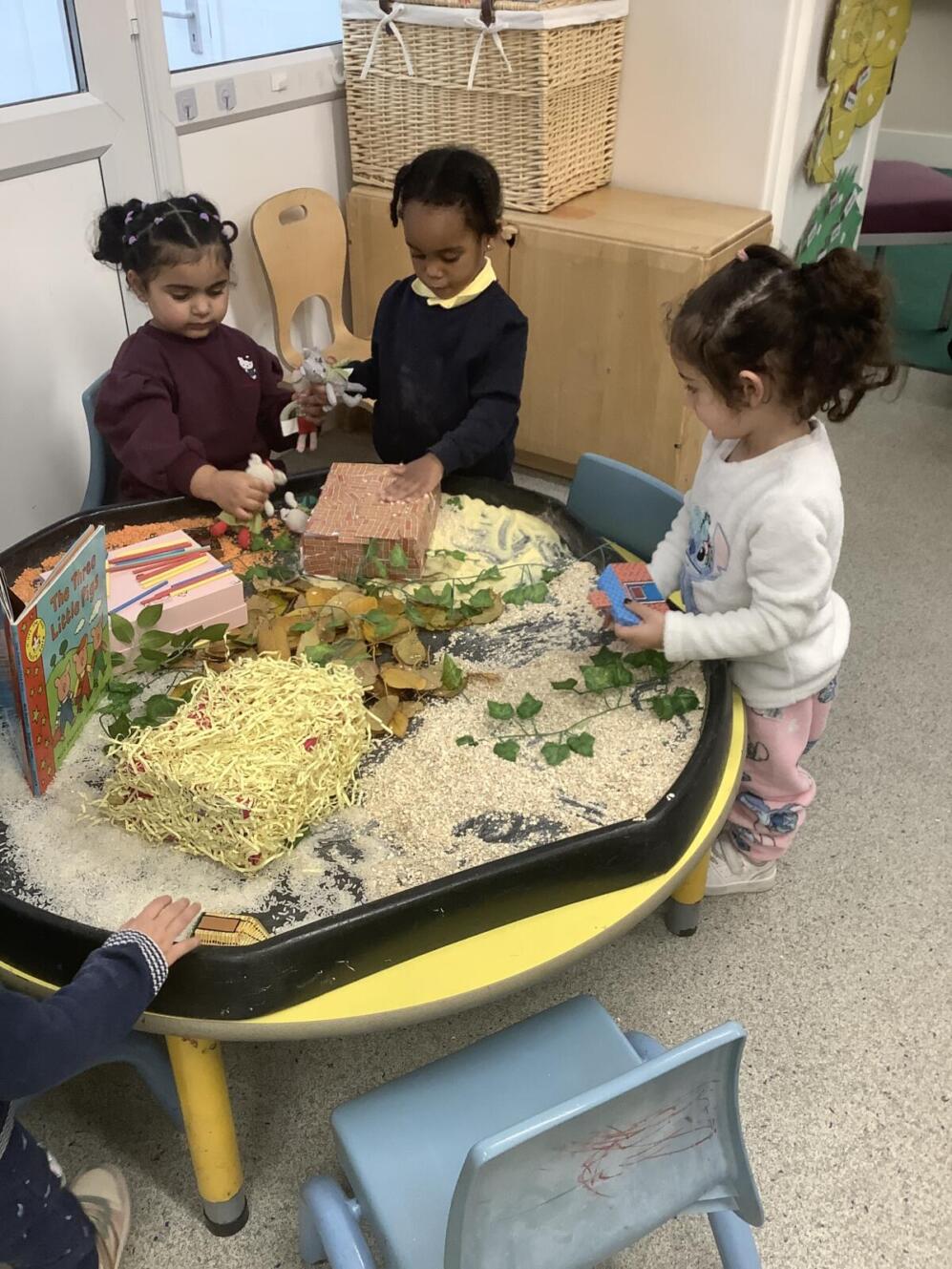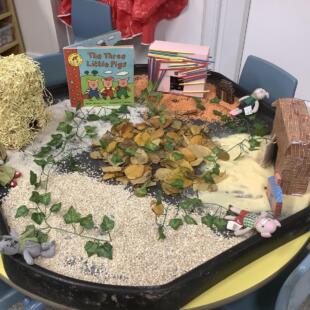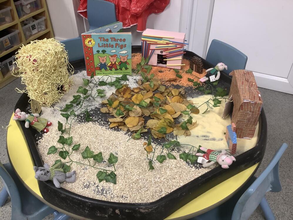 Another tray was set up with props from the story, allowing the children to retell and act out The Three Little Pigs in their own words. They enjoyed using the houses they had created, helping them to see that their work is valued. The children had lots of fun, and there was plenty of huffing and puffing as they immersed themselves in the story.