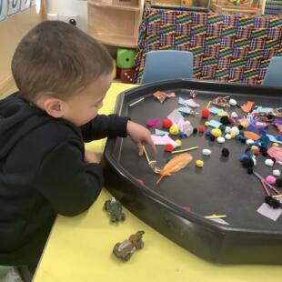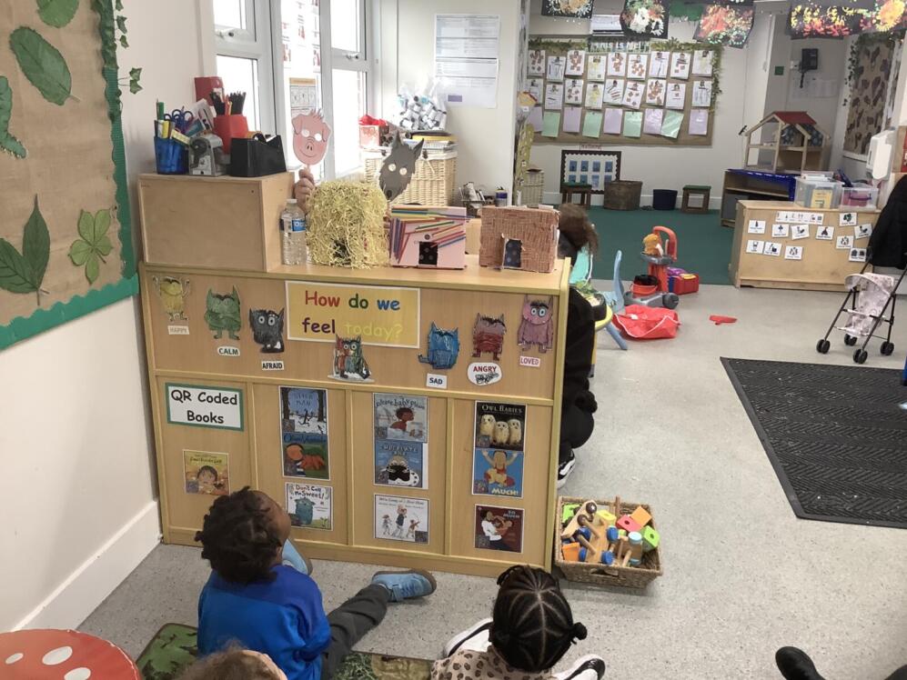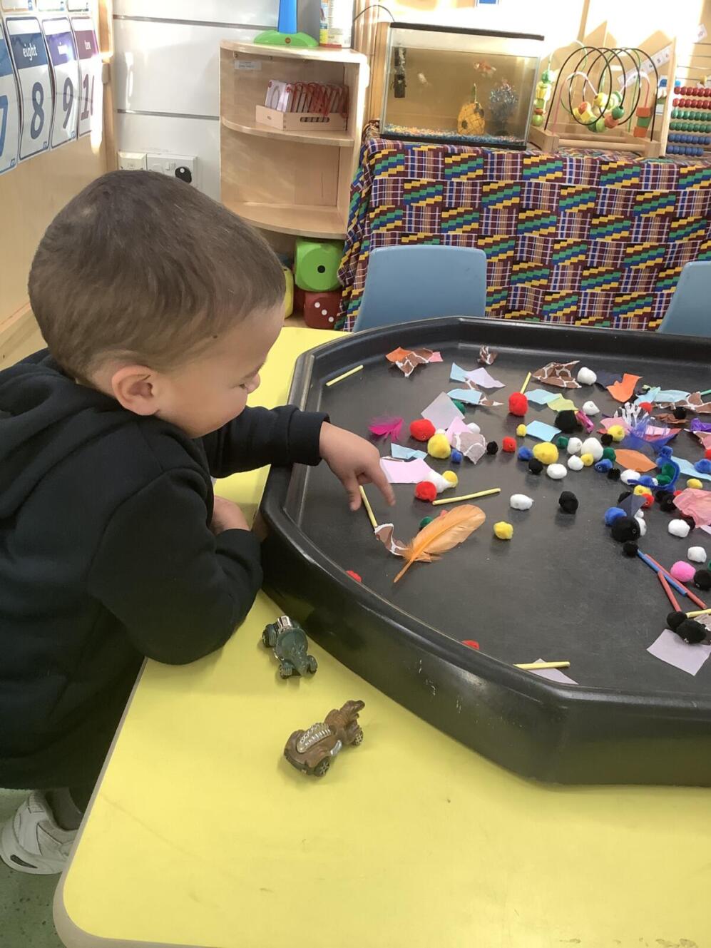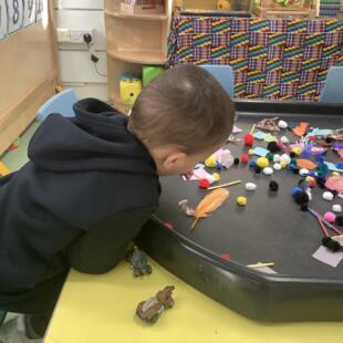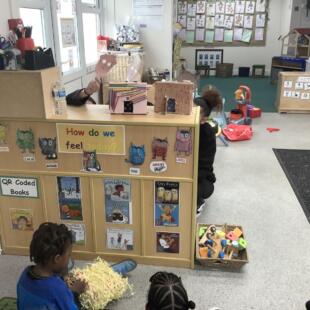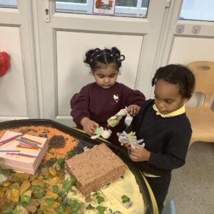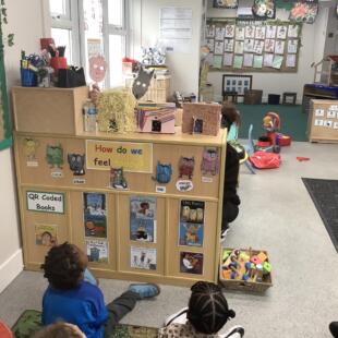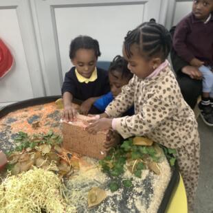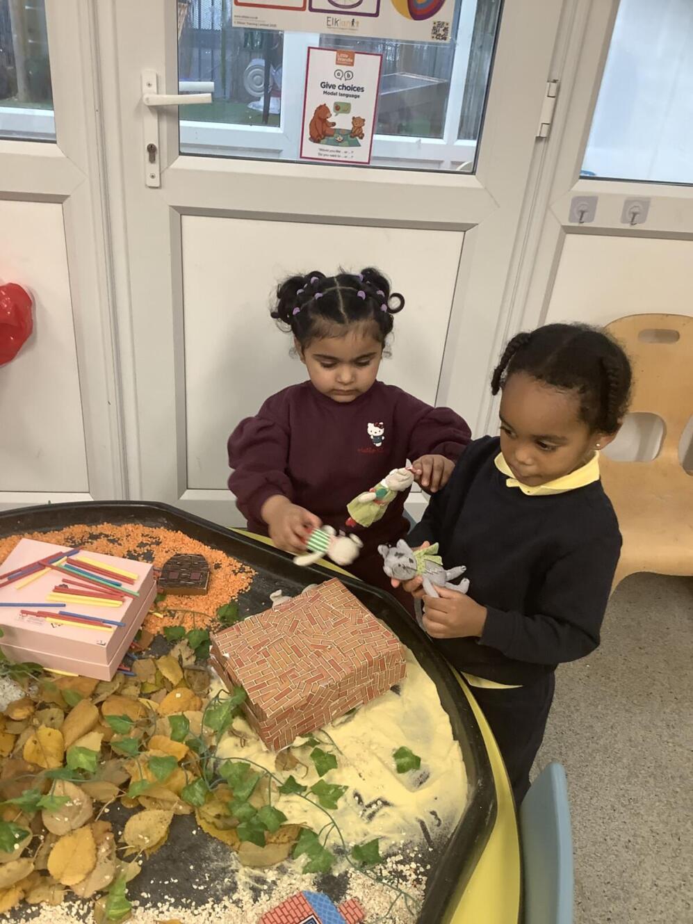 Another tray was set up with props from the story, allowing the children to retell and act out The Three Little Pigs in their own words. They enjoyed using the houses they had created, helping them to see that their work is valued. The children had lots of fun, and there was plenty of huffing and puffing as they immersed themselves in the story.