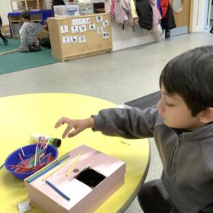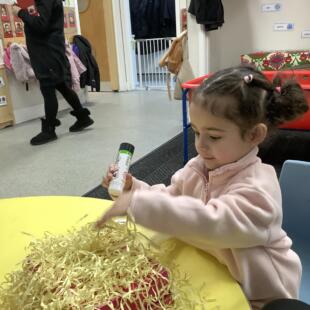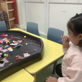 The children also had the opportunity to practise their blowing skills, just like the “Big Bad Wolf”. Using straws, they blew lightweight objects around a tray, watching how their breath made the items move. They found this experience both fun and engaging.
