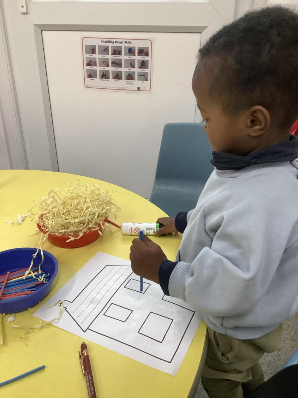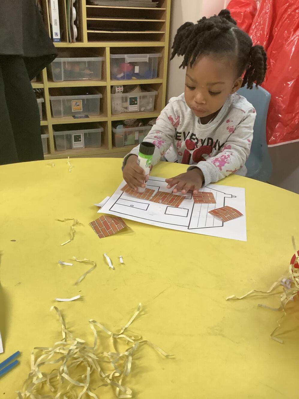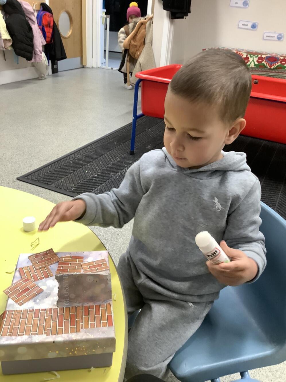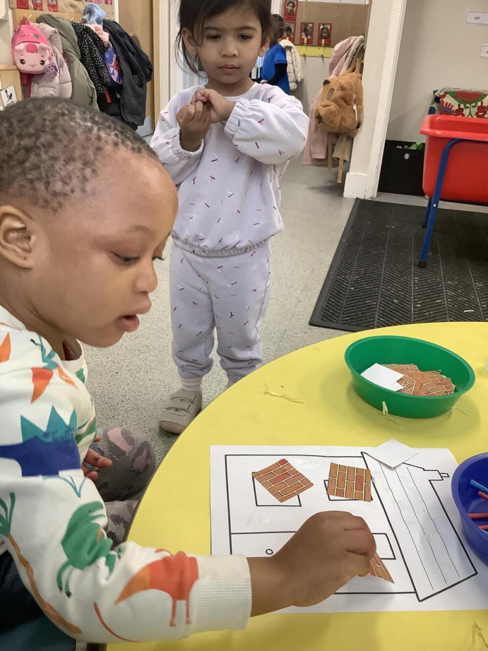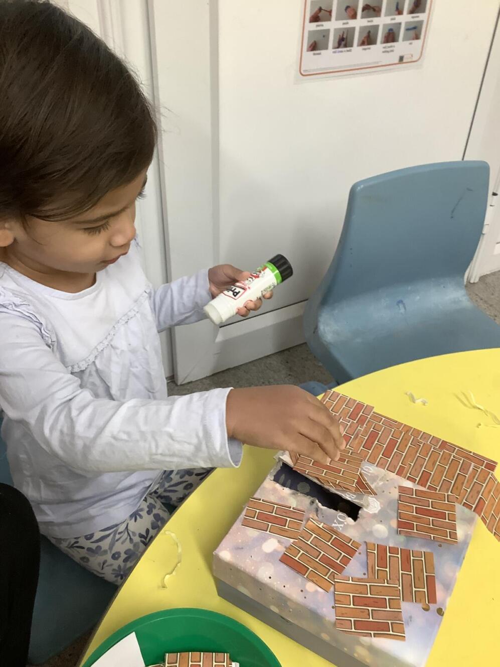 One of the most exciting activities involved recreating the houses from The Three Little Pigs. The children used a range of materials, including straw, small sticks, and paper bricks, along with glue sticks to construct their houses. Many children showed great curiosity as they explored the different textures of the materials. They experimented with how each material adhered to paper, applying glue carefully and pressing pieces down with focused concentration. Throughout the activity, they demonstrated developing fine motor skills as they picked up and placed small items, as well as problem-solving skills when materials didn’t stick straight away. They also engaged in simple conversations about the story, using key phrases such as “straw house,” “little pigs,” and “big bad wolf.”