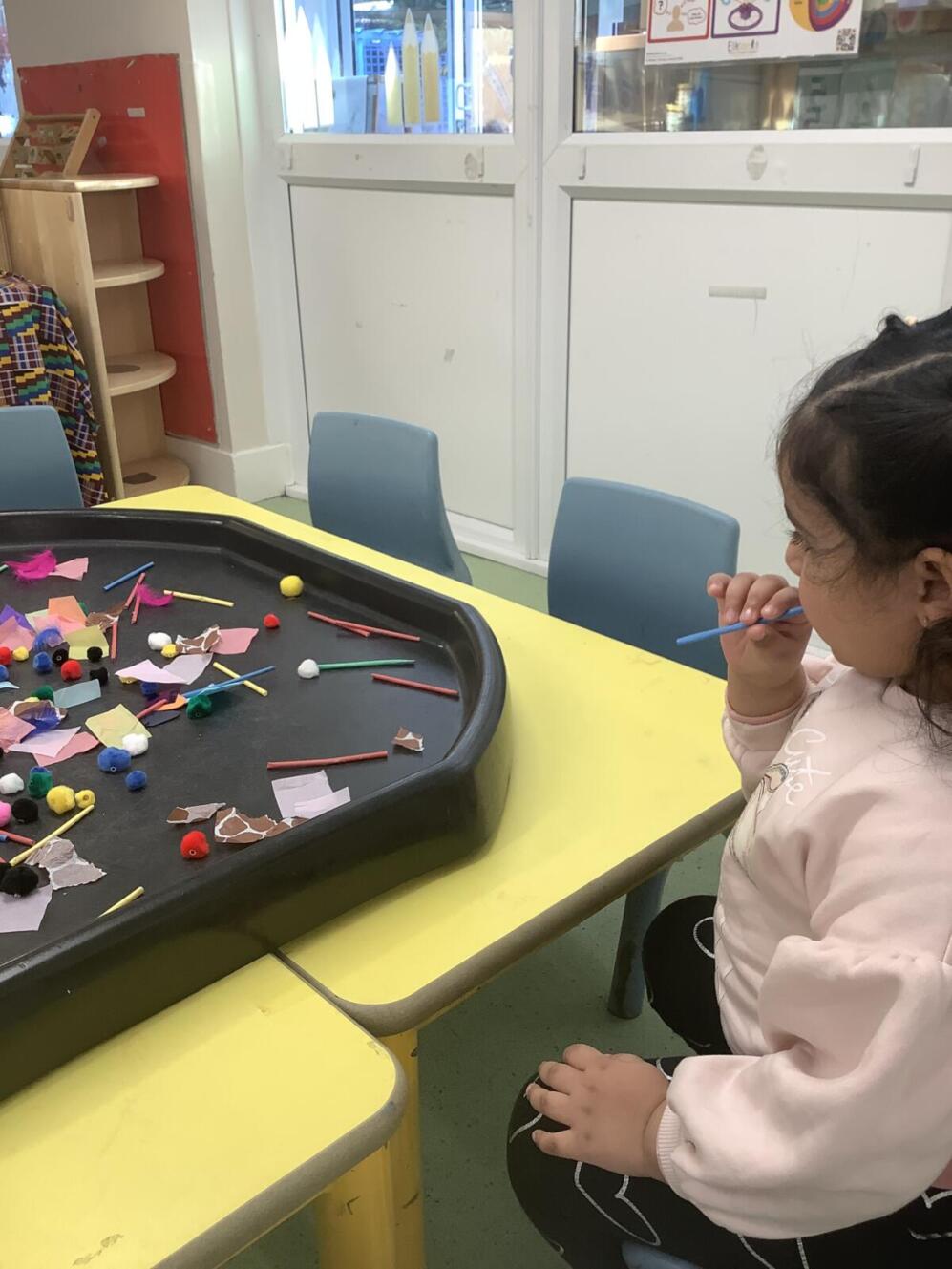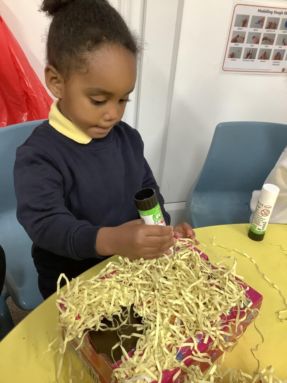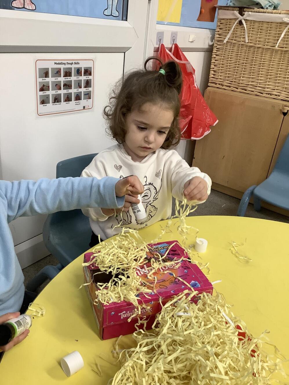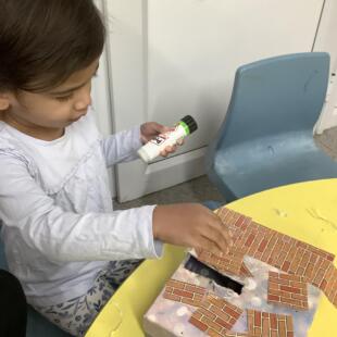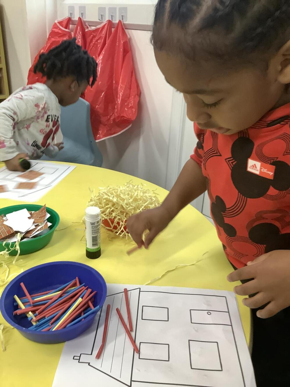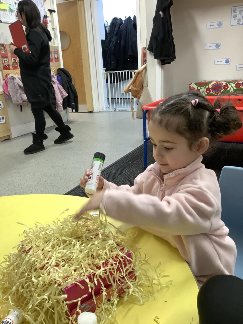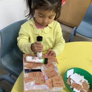 One of the most exciting activities involved recreating the houses from The Three Little Pigs. The children used a range of materials, including straw, small sticks, and paper bricks, along with glue sticks to construct their houses. Many children showed great curiosity as they explored the different textures of the materials. They experimented with how each material adhered to paper, applying glue carefully and pressing pieces down with focused concentration. Throughout the activity, they demonstrated developing fine motor skills as they picked up and placed small items, as well as problem-solving skills when materials didn’t stick straight away. They also engaged in simple conversations about the story, using key phrases such as “straw house,” “little pigs,” and “big bad wolf.”