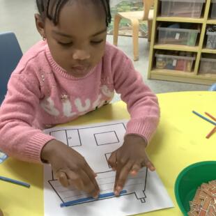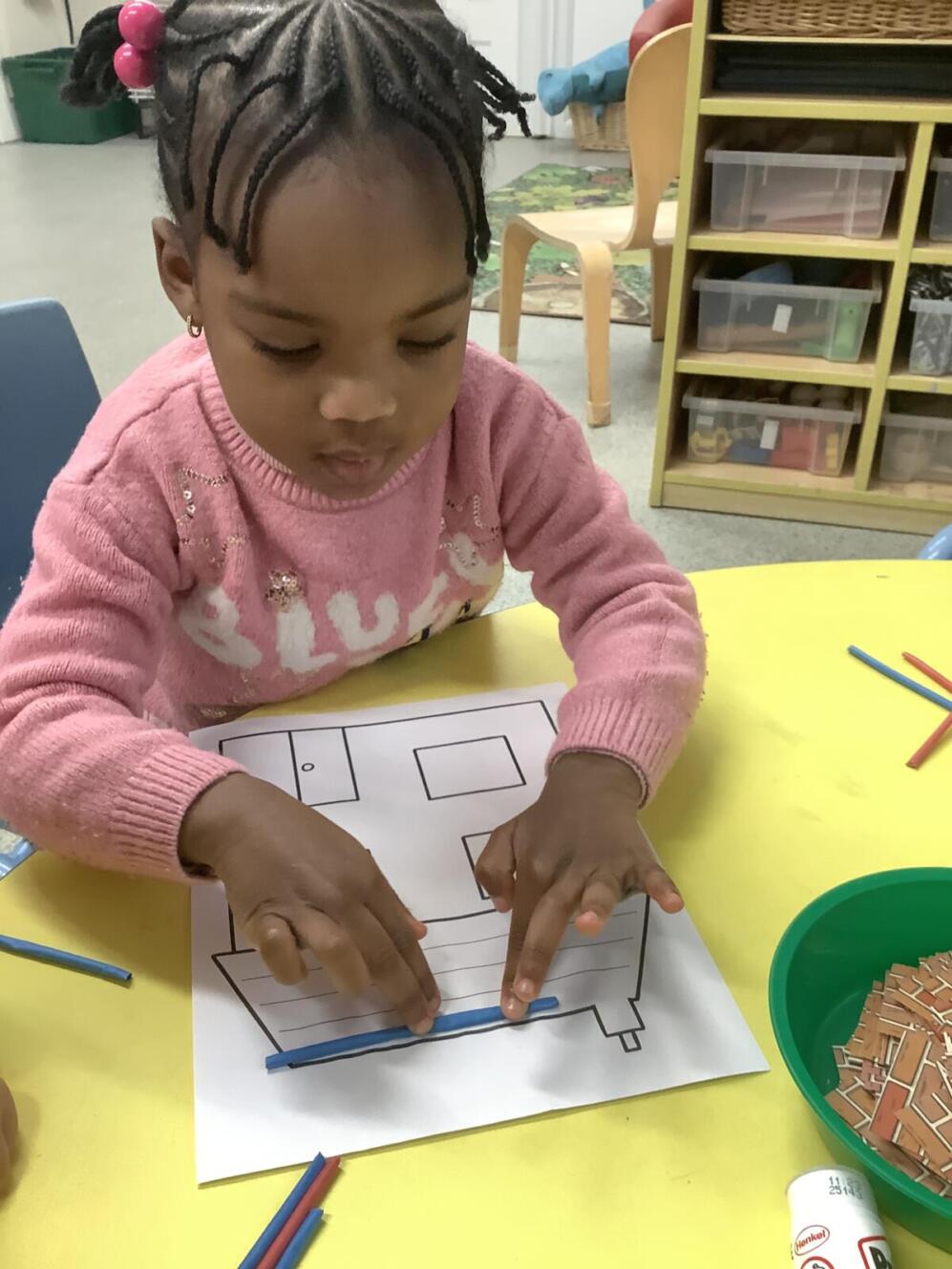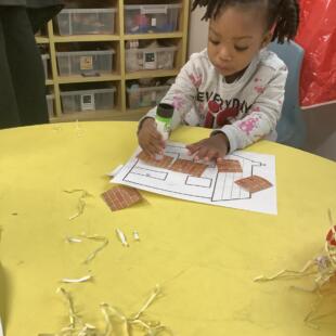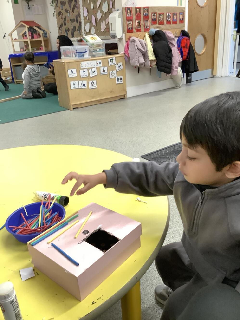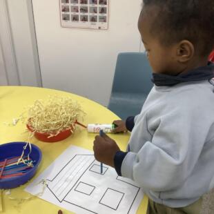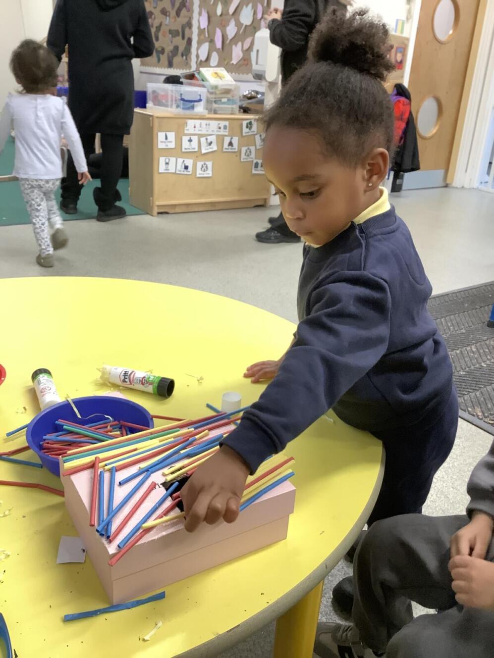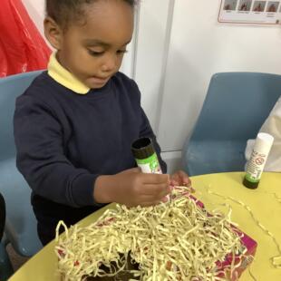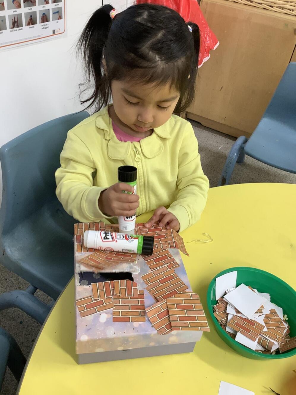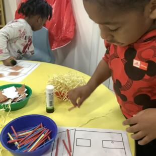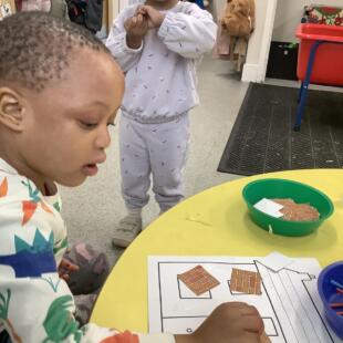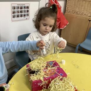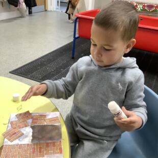 One of the most exciting activities involved recreating the houses from The Three Little Pigs. The children used a range of materials, including straw, small sticks, and paper bricks, along with glue sticks to construct their houses. Many children showed great curiosity as they explored the different textures of the materials. They experimented with how each material adhered to paper, applying glue carefully and pressing pieces down with focused concentration. Throughout the activity, they demonstrated developing fine motor skills as they picked up and placed small items, as well as problem-solving skills when materials didn’t stick straight away. They also engaged in simple conversations about the story, using key phrases such as “straw house,” “little pigs,” and “big bad wolf.”