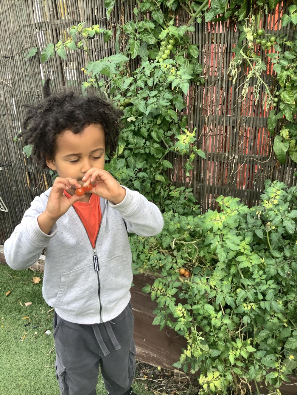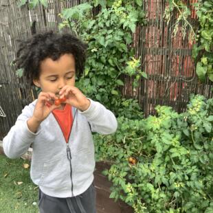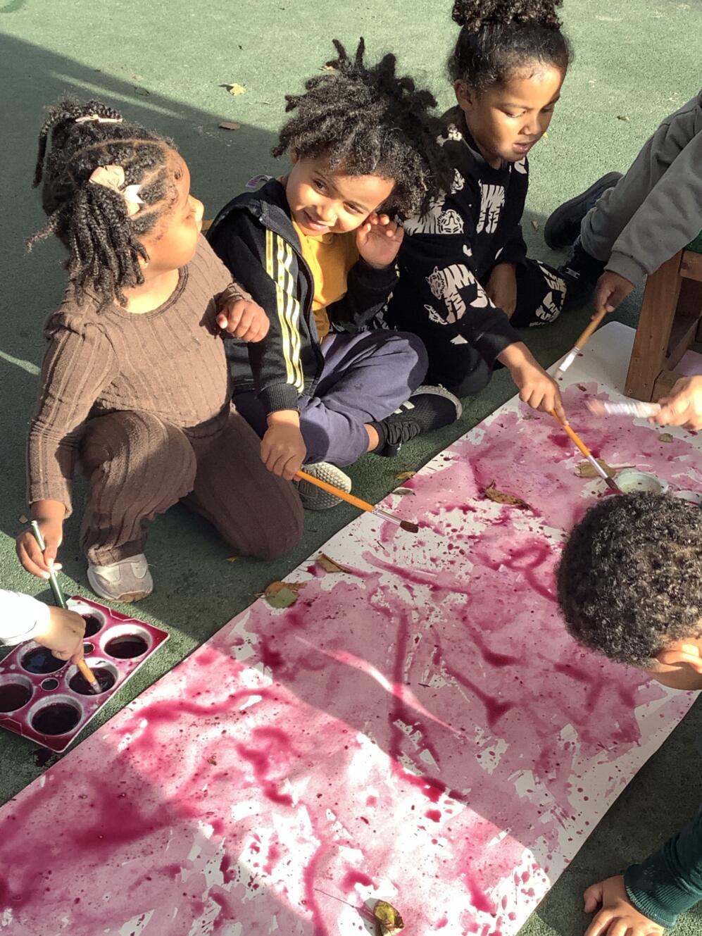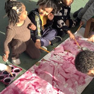 The last of our beetroot and some surprise tomatoes were harvested. The peel, along with the tops and tails from our homegrown, snack time beetroot were added to hot water before being pressed and squeezed to produce a vibrantly coloured medium for our brushes, fingers and rollers to do their thing!