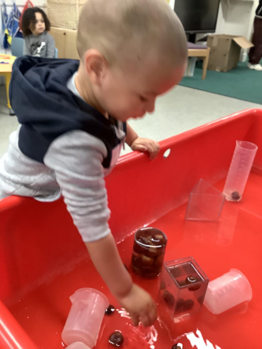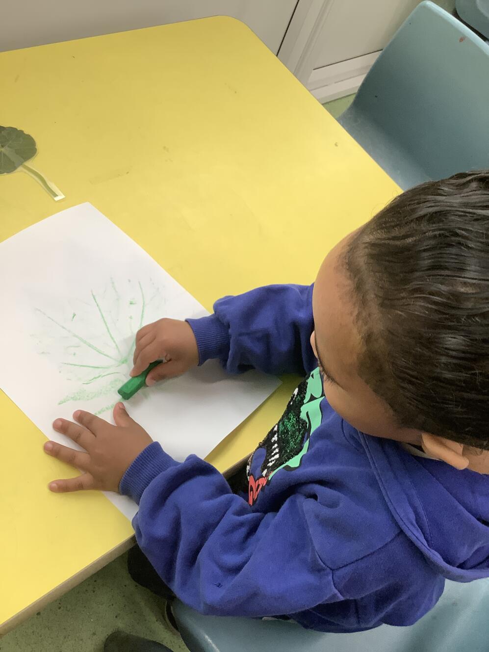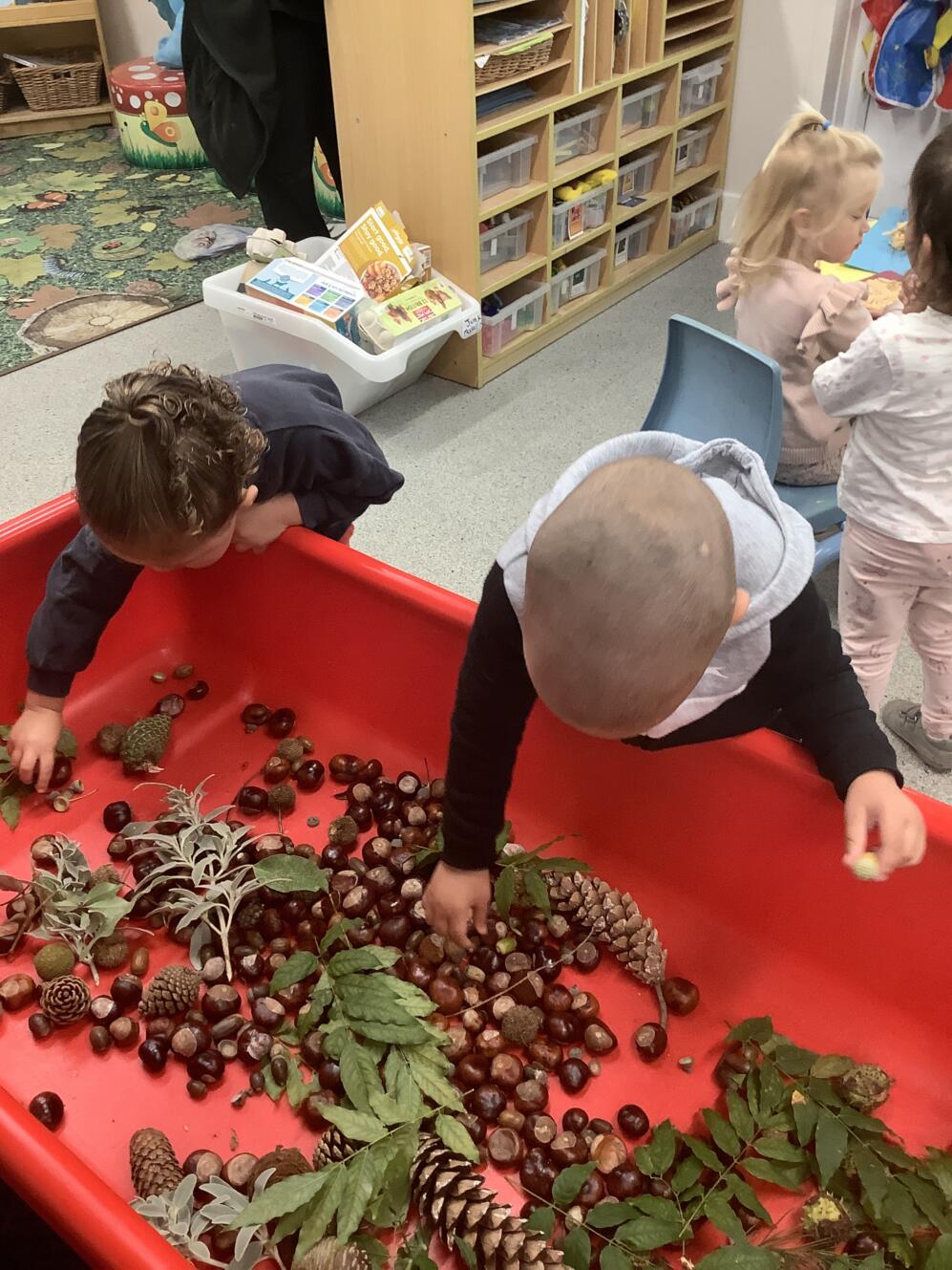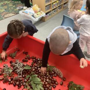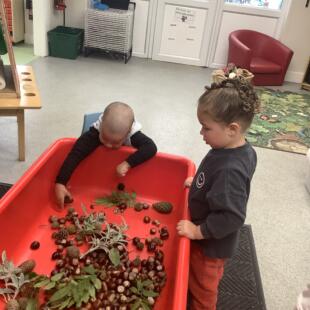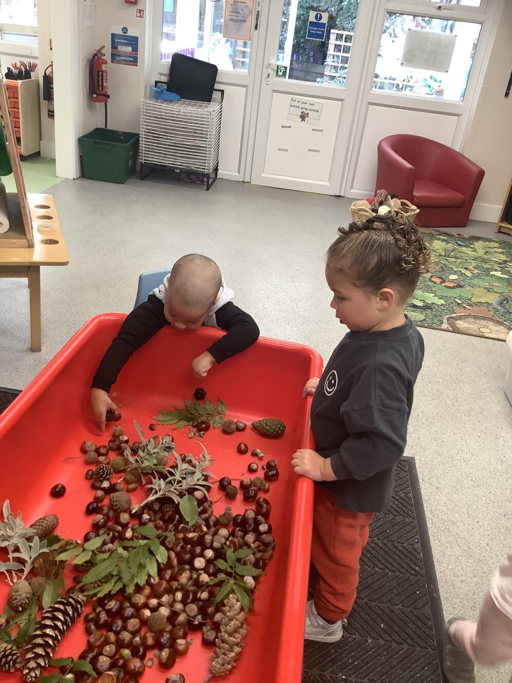 This week, Ladybird class have been exploring the natural materials that have been brought in by the parents. They have had the opportunity explore the different textures they could feel on fir cones, acorns and conkers. This has enriched the language within the setting, with lots of new vocabulary as the materials were named and described by both the children and the educators. We used the conkers in the water play, observing and using the language around sinking and floating. We also gathered several different leaves from the garden using wax crayons and paper to create rubbings which turned out amazingly.