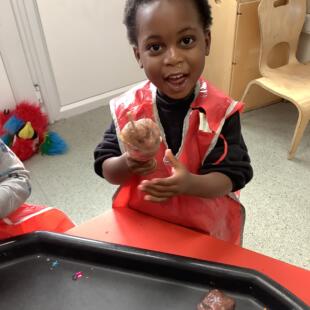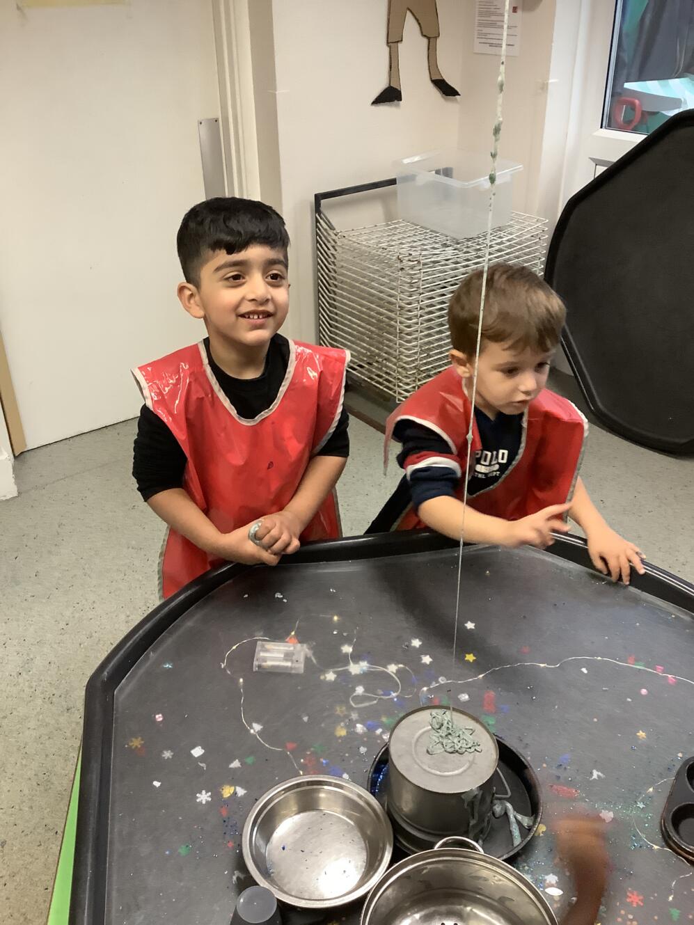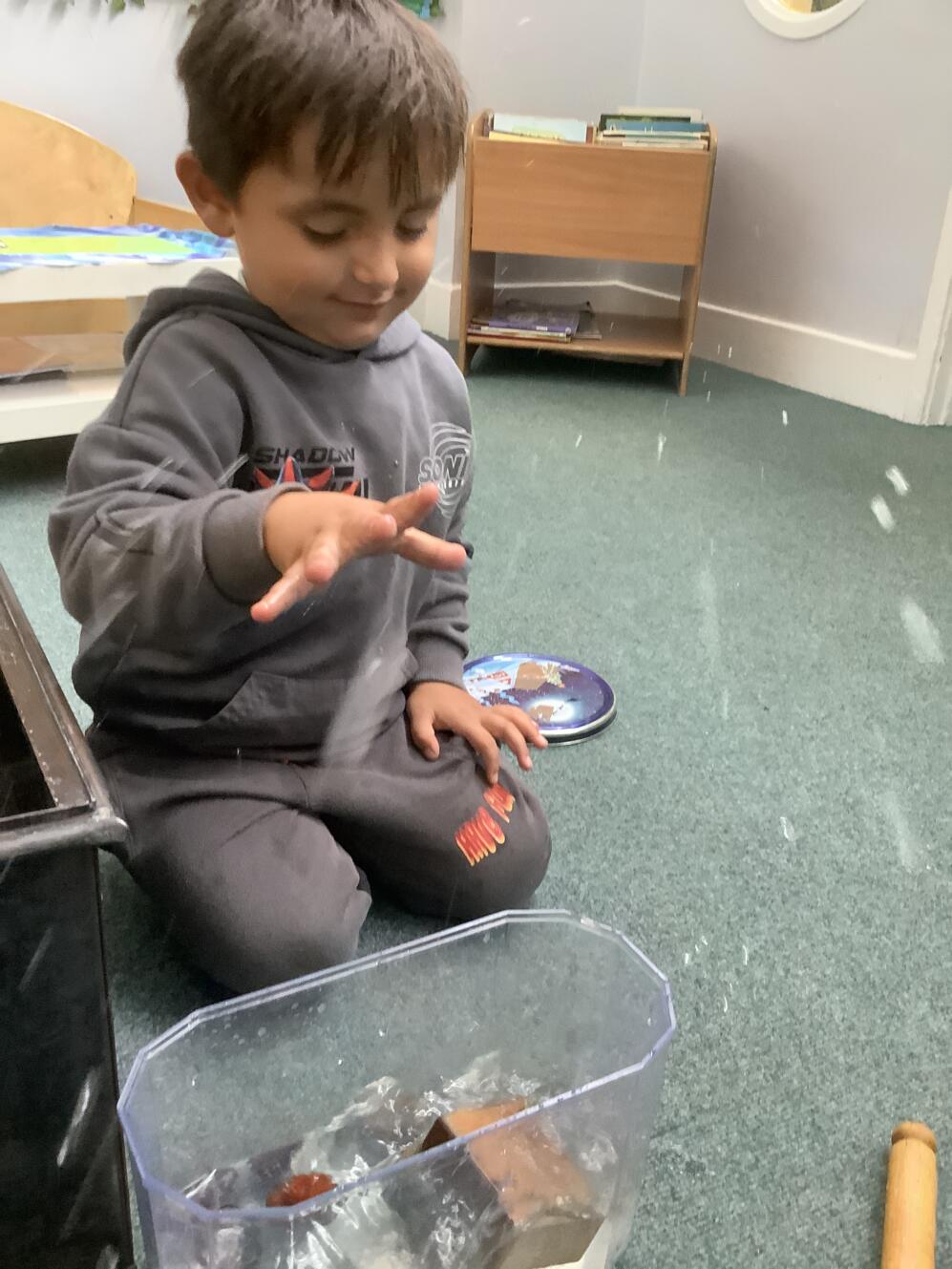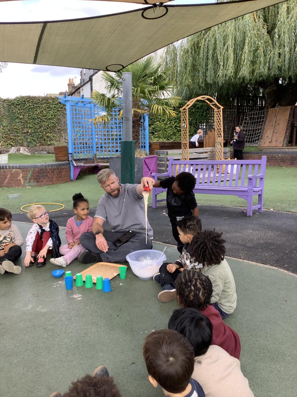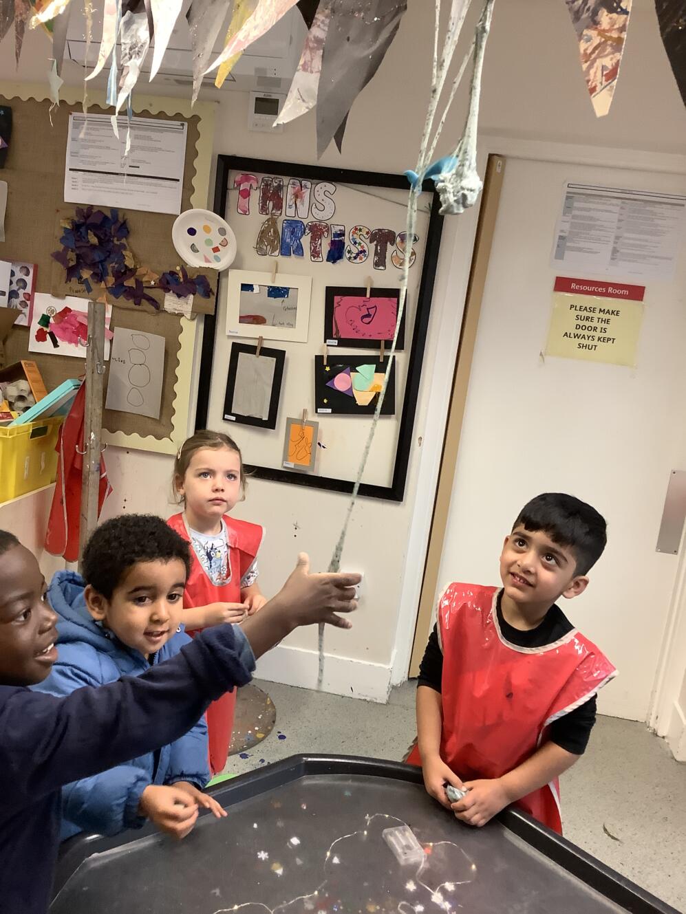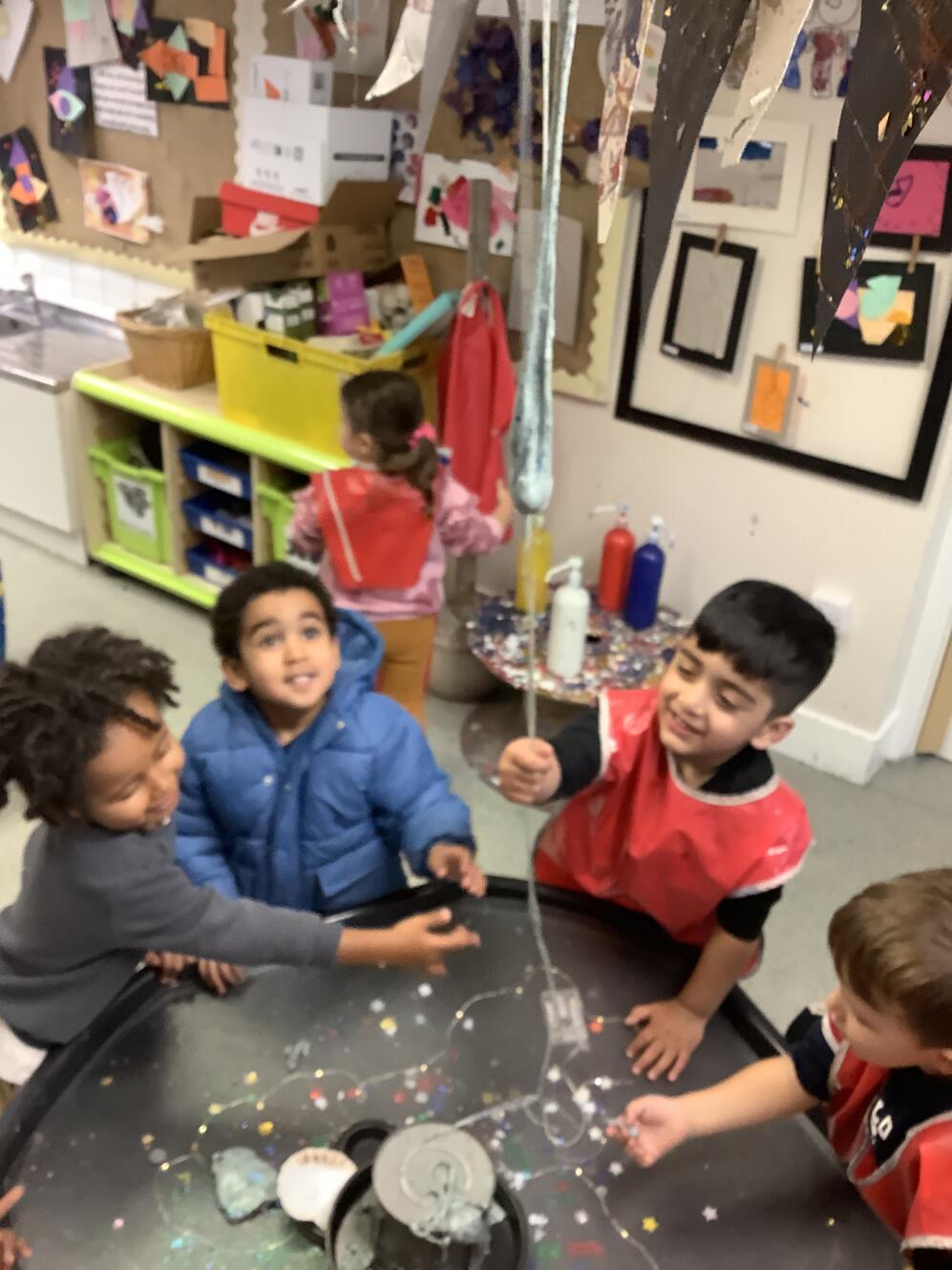 Helen’s slime factory was on top form this week. Two batches of slime meant two very different sensory experiences for the children. A wonderful talking point is created as the textures and properties of the slime change throughout the week. From a sticky, hand binding, “yucky” experience…to a stretching, rubbery, bouncing ball; the slime engages children throughout the week and provides a shared experience, quiet independent exploration and often energetic, somewhat raucous expressions of shock and surprise!