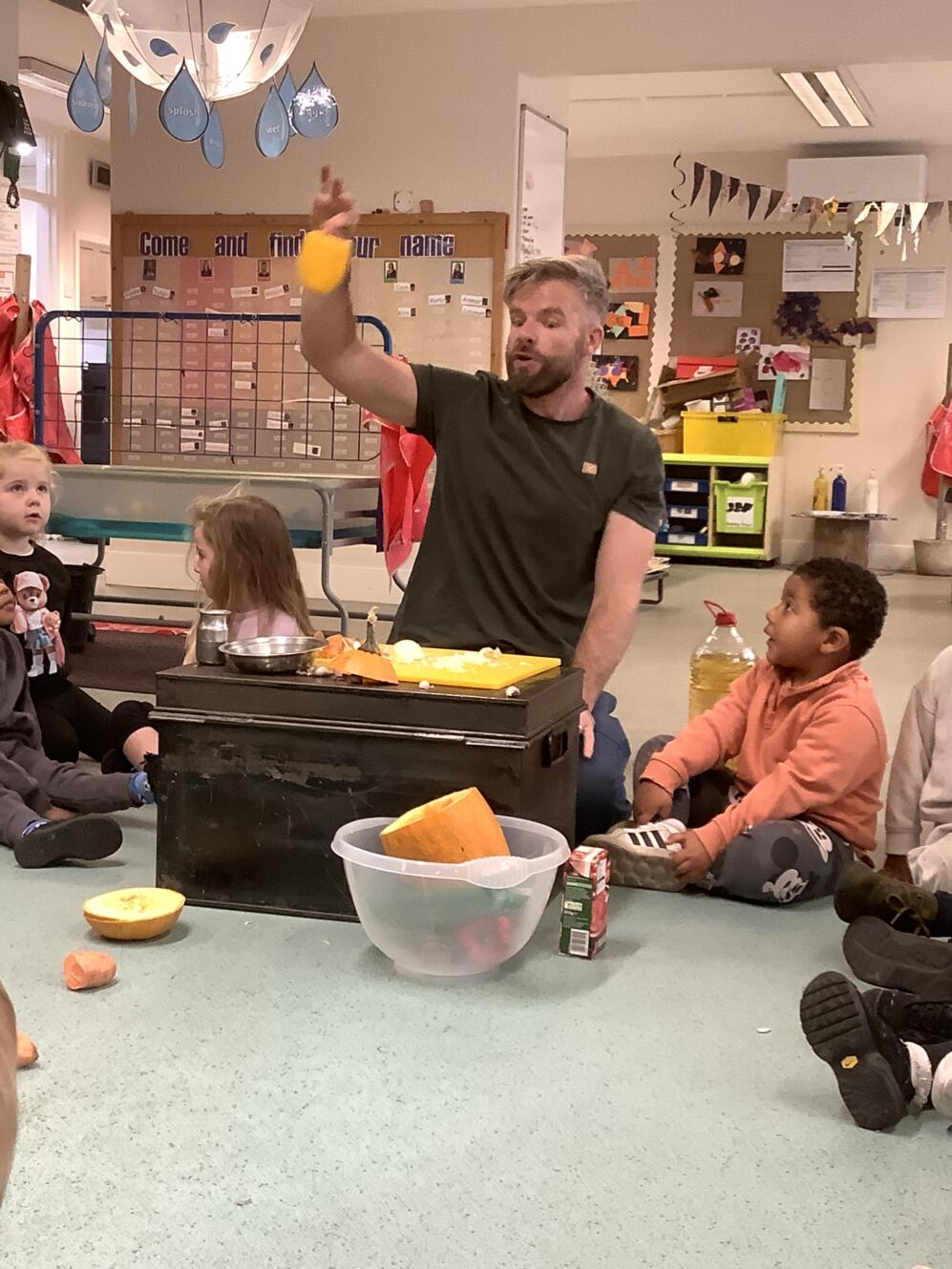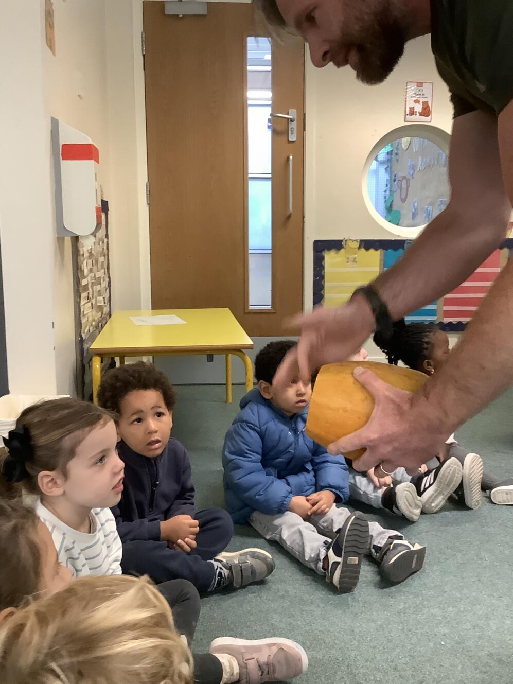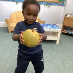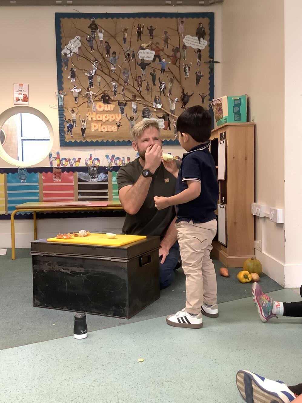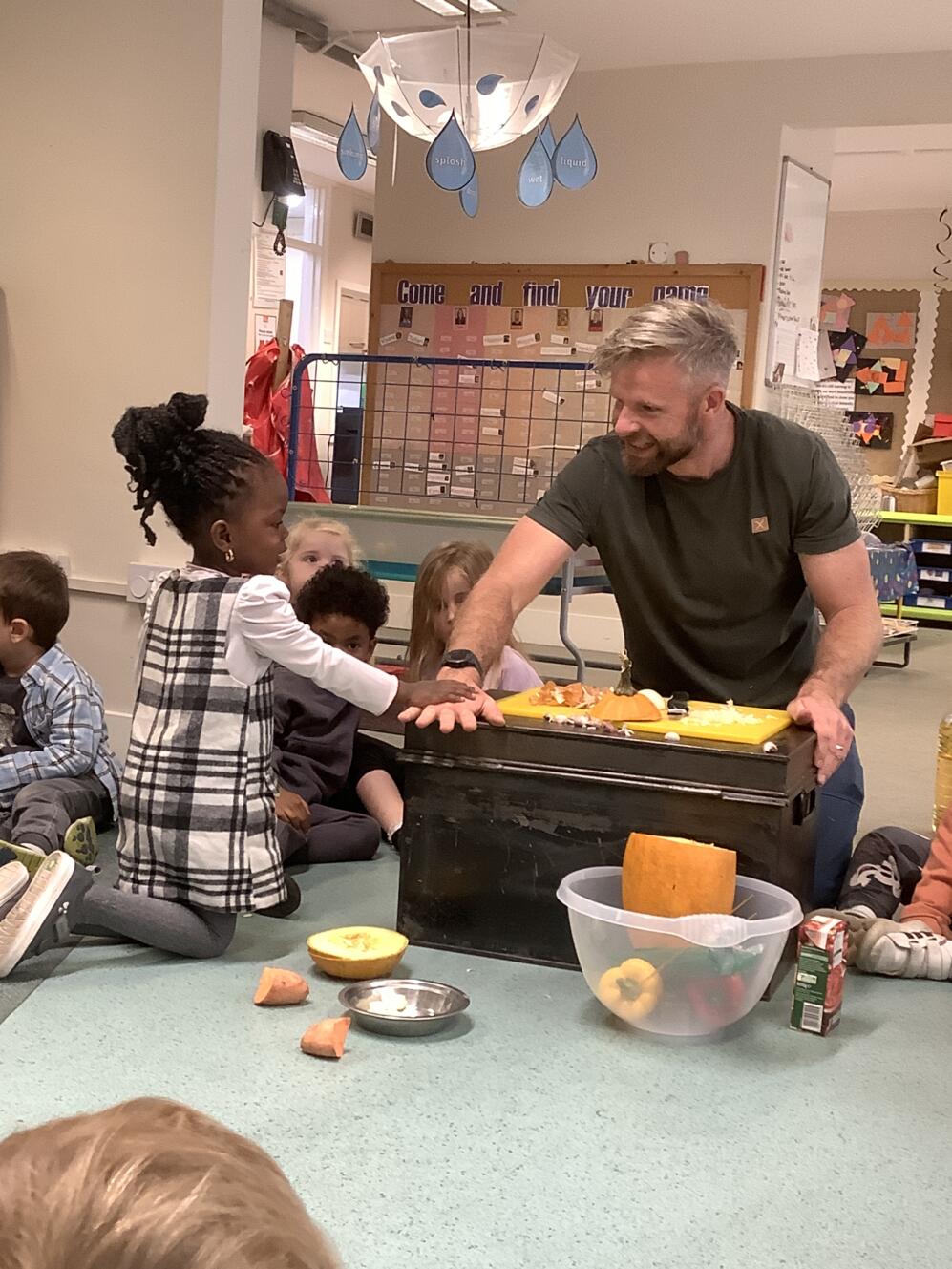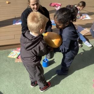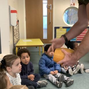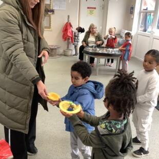 Having picked our two surviving pumpkins last week, it was cooking and feasting time! In years gone by, teachers have attempted pumpkin soup, pumpkin bites and pumpkin pies…with limited success…this year it was pumpkin spaghetti time. In group time, the pumpkin’s were handled, chopped, deseeded and inspected by the children. The slimy seeds were passed around, counted and placed to dry for next year’s planting and the next generation of Thornton Heath pumpkins. Next, the children observed onion being chopped before having a chance to smell and handle the powerful vegetable! Little fingers then peeled garlic cloves, another feat for the senses and valuable exercise for growing hands and digits. We sorted the remaining ingredients of spaghetti, salt, oil, sweet peppers and passata before it was off to the kitchen. Many children observed as the ingredients were combined and cooked before it was feast time! It was thumbs up all round and a valuable experience, as our fledgling scientists grow to understand life cycles from seed, to plant and fruit; not as passive observers or listeners but as active participants.