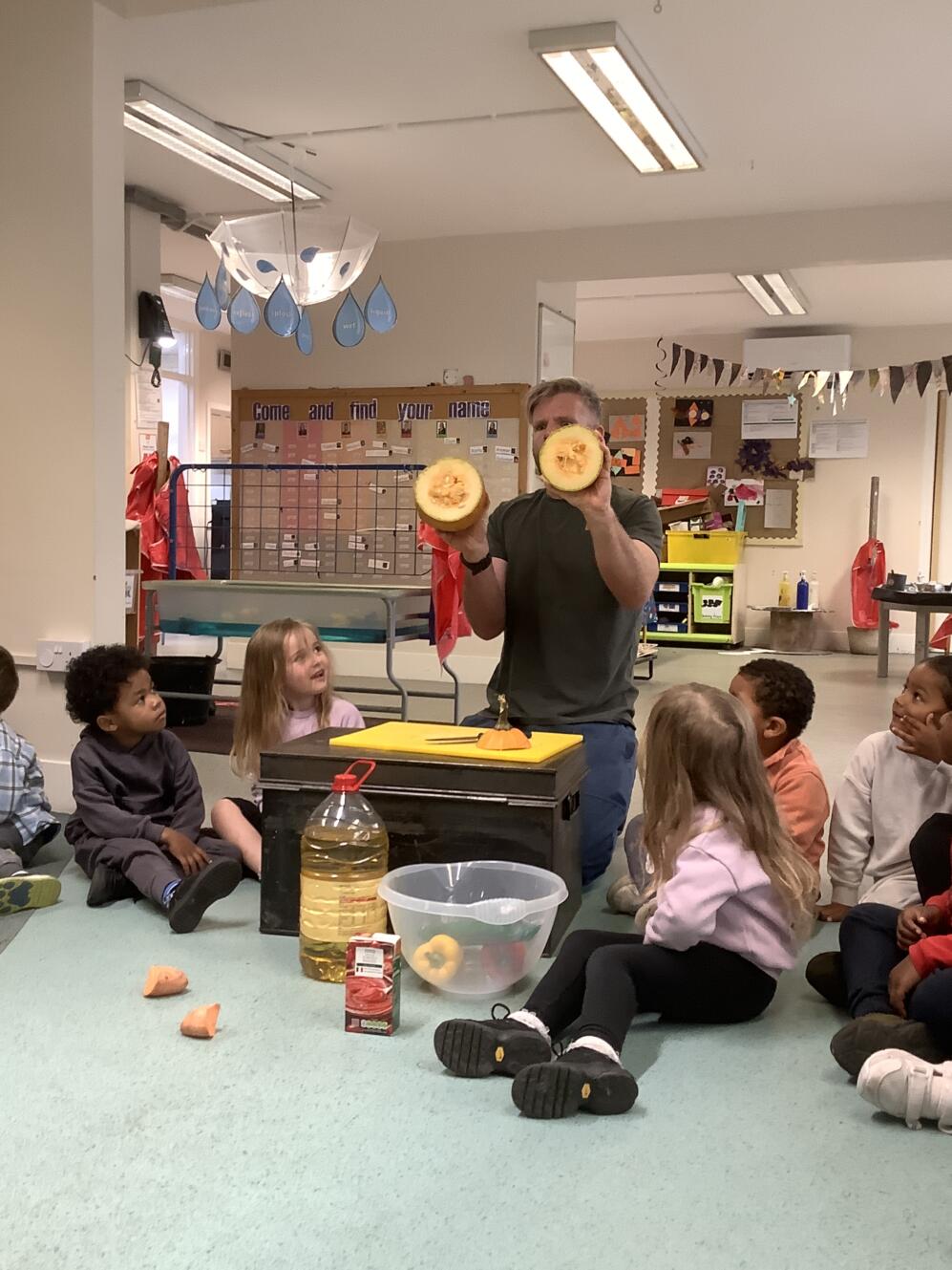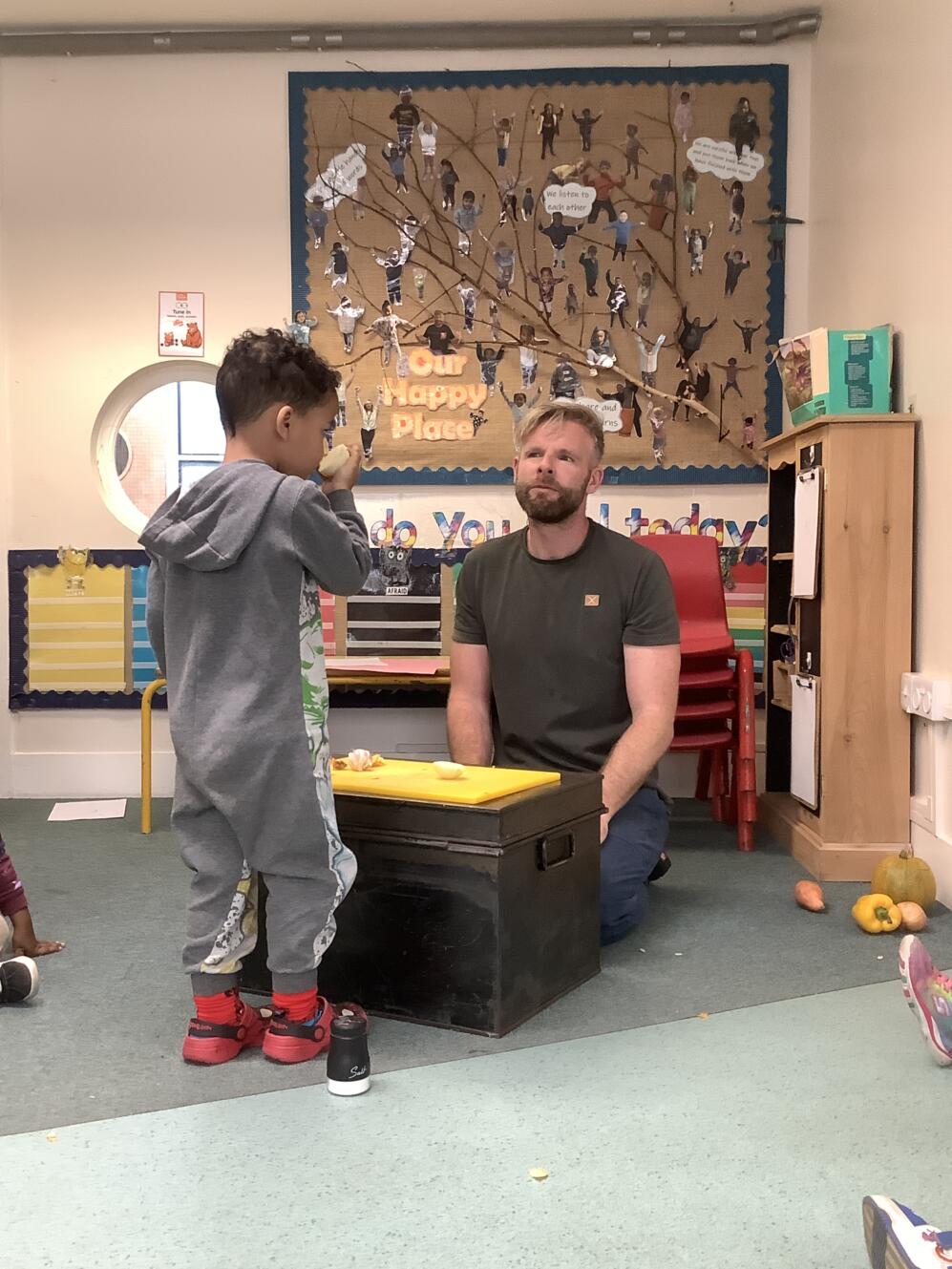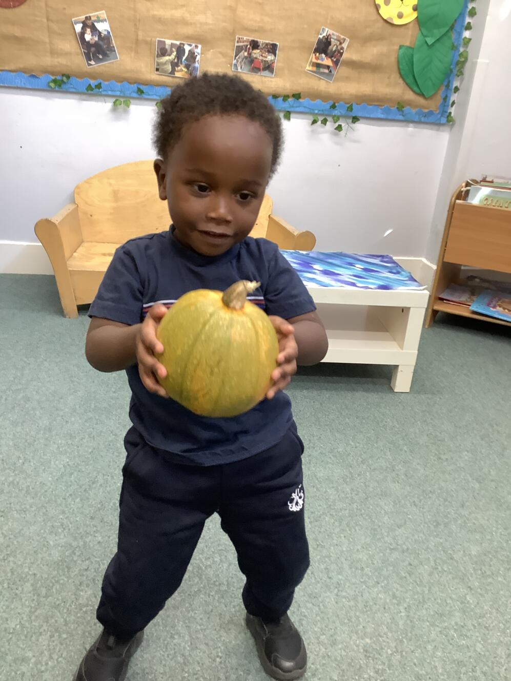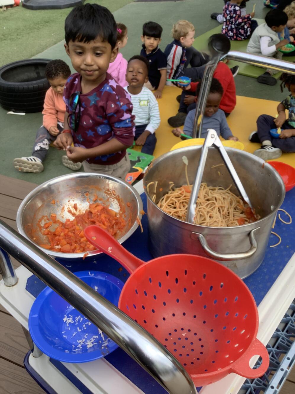 Having picked our two surviving pumpkins last week, it was cooking and feasting time! In years gone by, teachers have attempted pumpkin soup, pumpkin bites and pumpkin pies…with limited success…this year it was pumpkin spaghetti time. In group time, the pumpkin’s were handled, chopped, deseeded and inspected by the children. The slimy seeds were passed around, counted and placed to dry for next year’s planting and the next generation of Thornton Heath pumpkins. Next, the children observed onion being chopped before having a chance to smell and handle the powerful vegetable! Little fingers then peeled garlic cloves, another feat for the senses and valuable exercise for growing hands and digits. We sorted the remaining ingredients of spaghetti, salt, oil, sweet peppers and passata before it was off to the kitchen. Many children observed as the ingredients were combined and cooked before it was feast time! It was thumbs up all round and a valuable experience, as our fledgling scientists grow to understand life cycles from seed, to plant and fruit; not as passive observers or listeners but as active participants.
