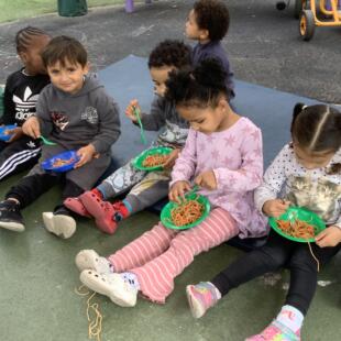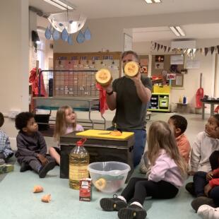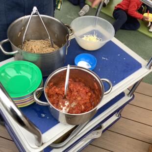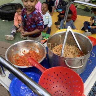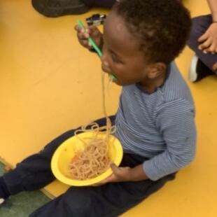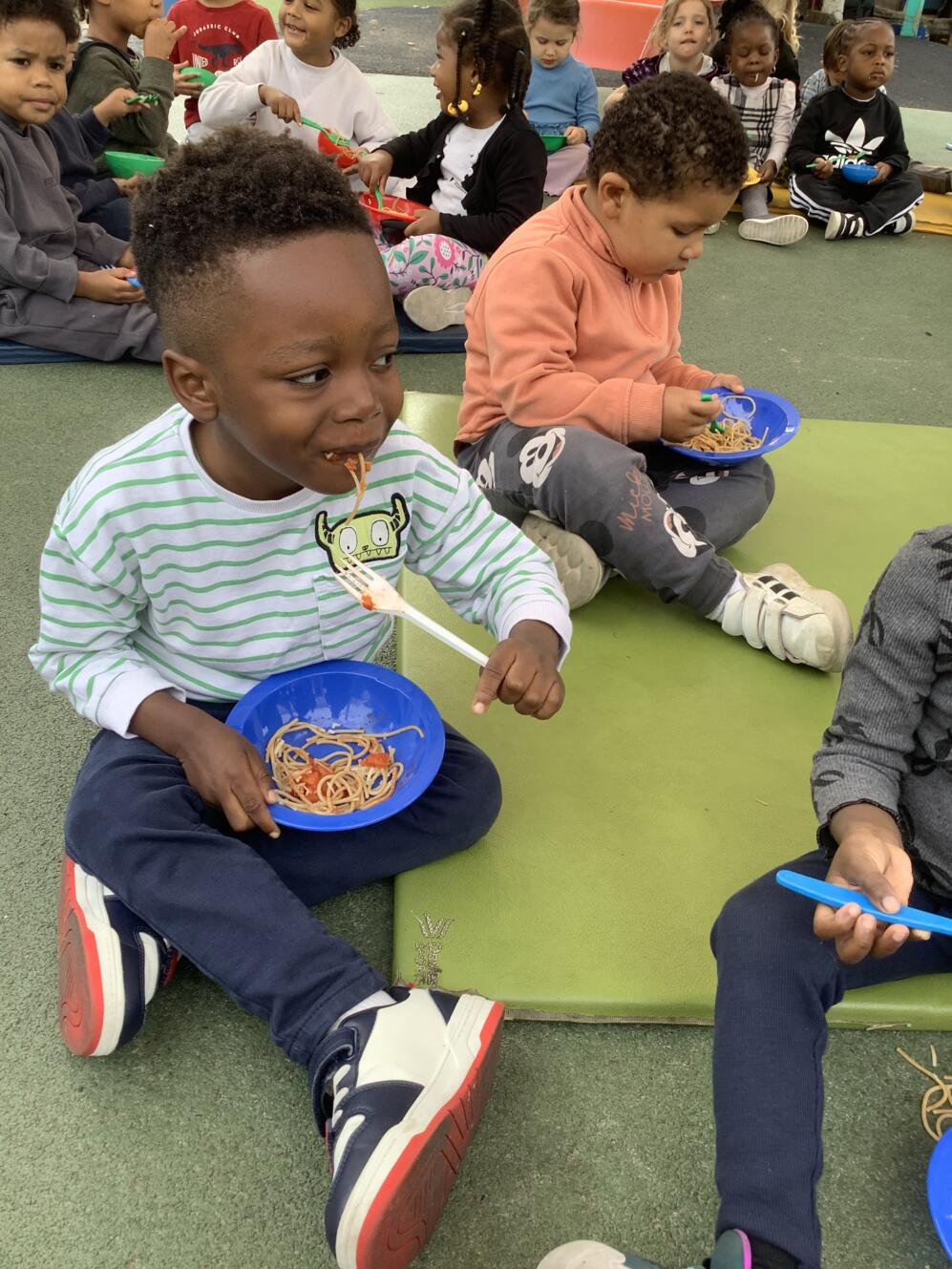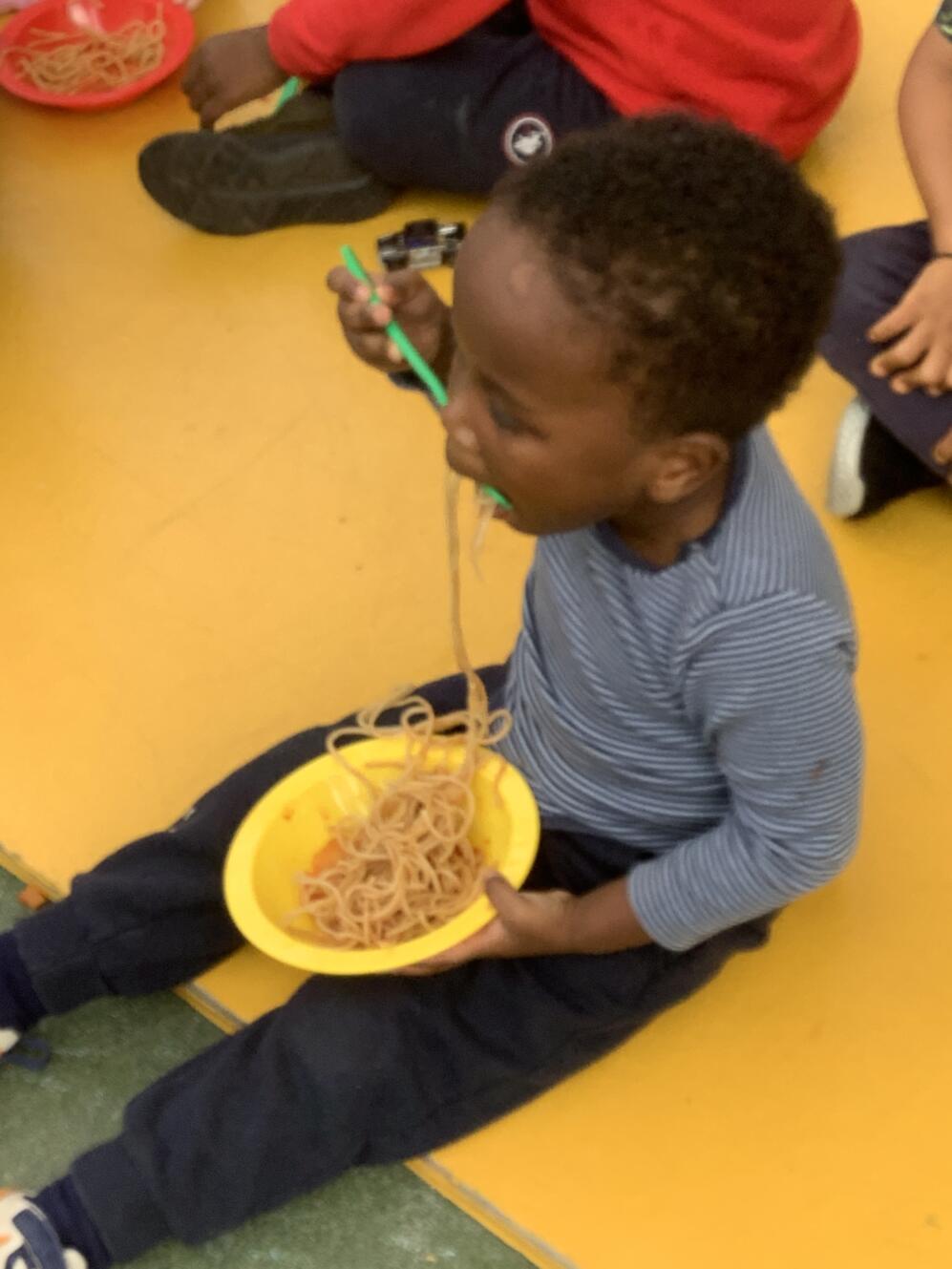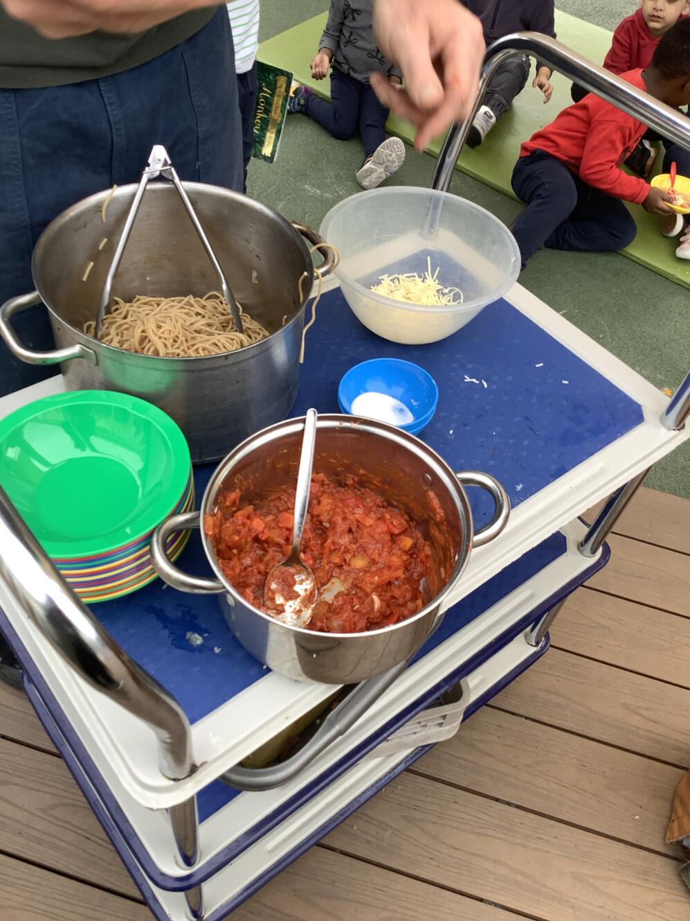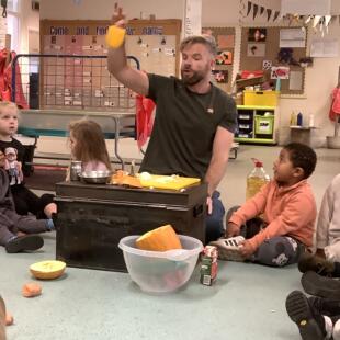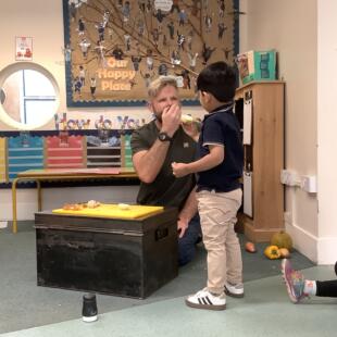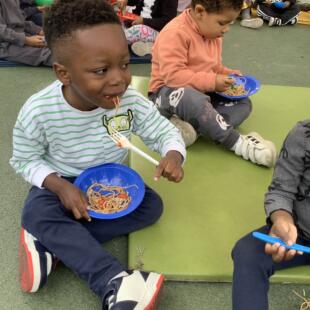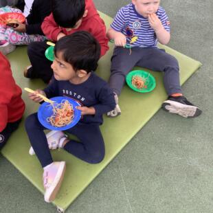 Having picked our two surviving pumpkins last week, it was cooking and feasting time! In years gone by, teachers have attempted pumpkin soup, pumpkin bites and pumpkin pies…with limited success…this year it was pumpkin spaghetti time. In group time, the pumpkin’s were handled, chopped, deseeded and inspected by the children. The slimy seeds were passed around, counted and placed to dry for next year’s planting and the next generation of Thornton Heath pumpkins. Next, the children observed onion being chopped before having a chance to smell and handle the powerful vegetable! Little fingers then peeled garlic cloves, another feat for the senses and valuable exercise for growing hands and digits. We sorted the remaining ingredients of spaghetti, salt, oil, sweet peppers and passata before it was off to the kitchen. Many children observed as the ingredients were combined and cooked before it was feast time! It was thumbs up all round and a valuable experience, as our fledgling scientists grow to understand life cycles from seed, to plant and fruit; not as passive observers or listeners but as active participants.