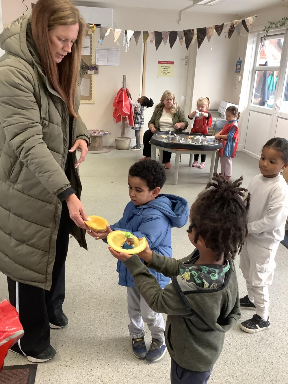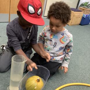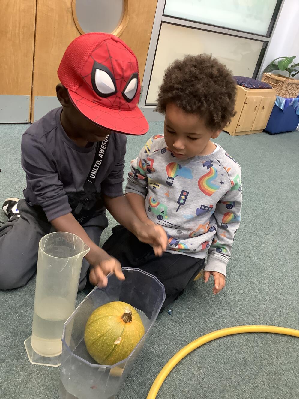 The tops and tails of our pumpkins were put to good use by Tracey and the children, who scooped out boats to be tested in the water tray…would they float or sink?…