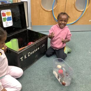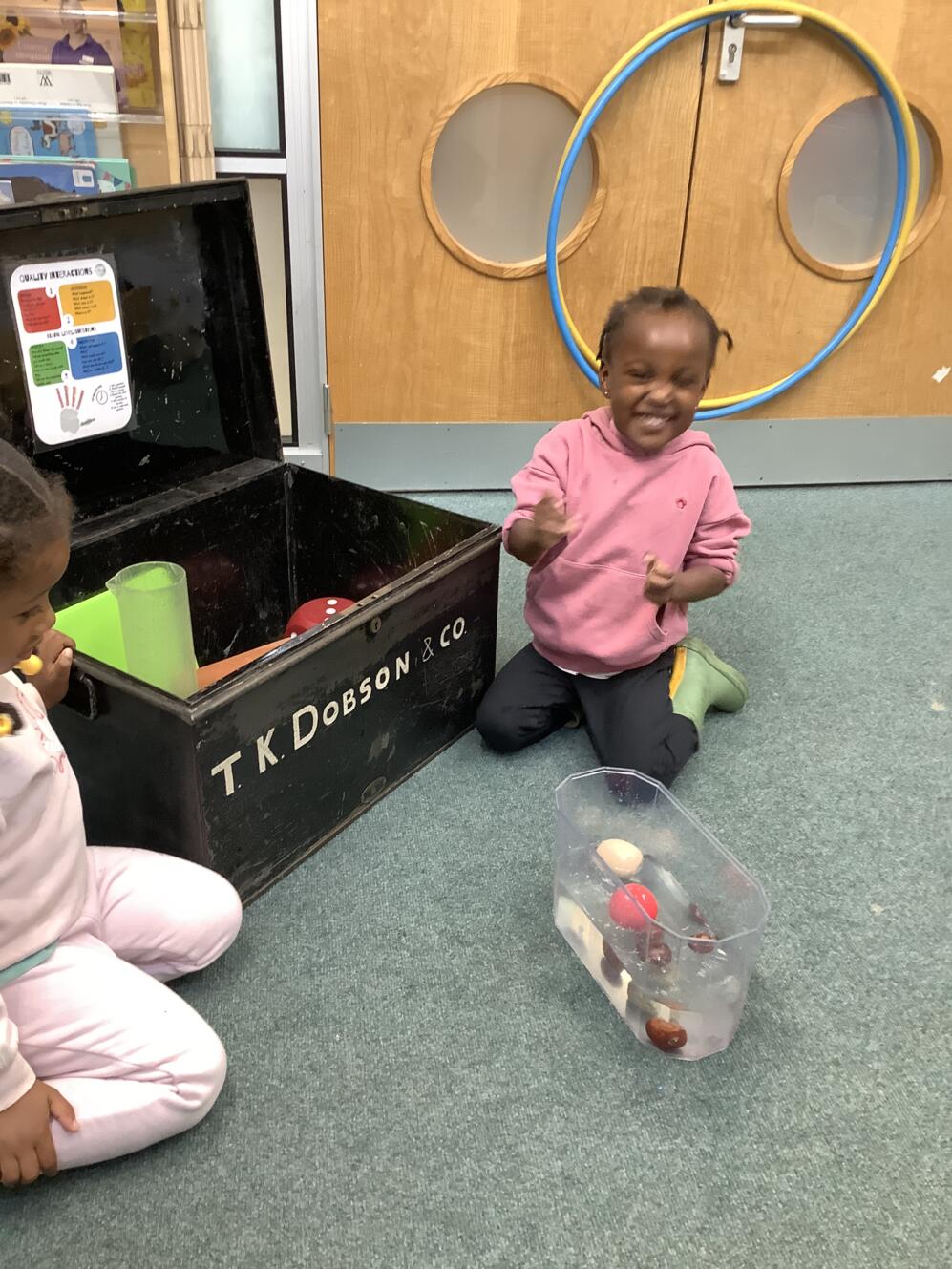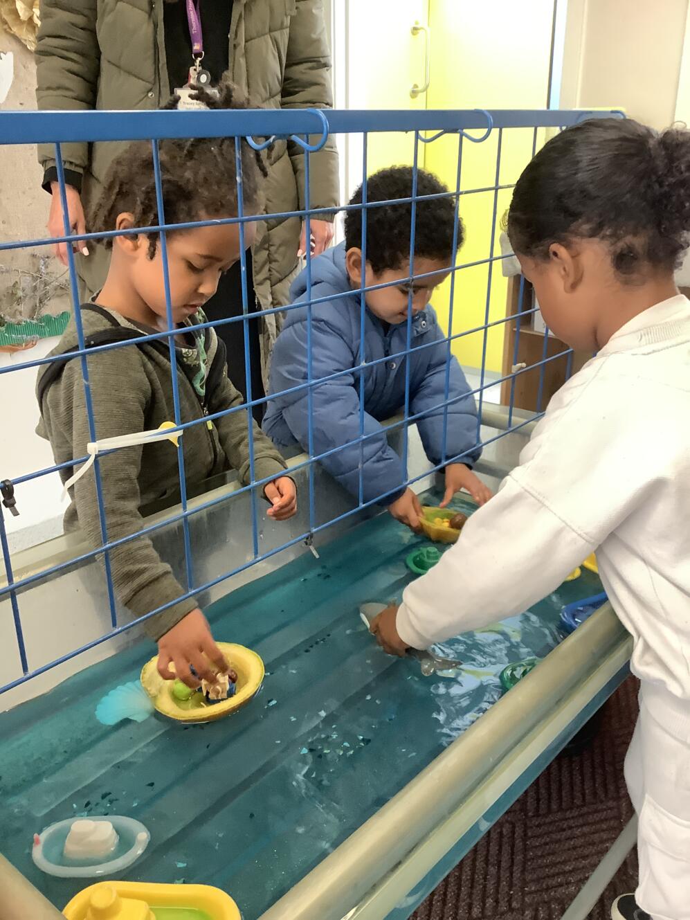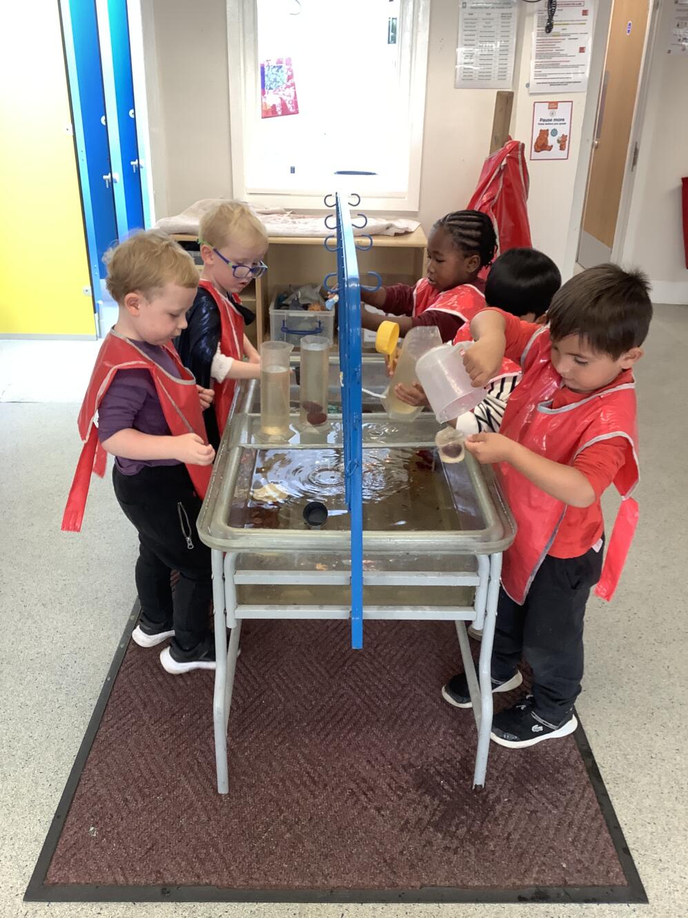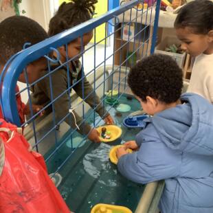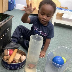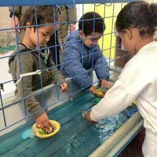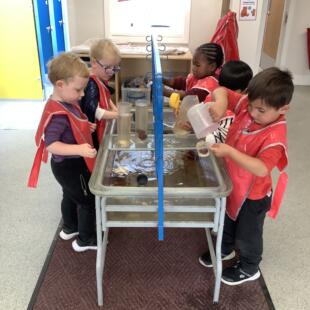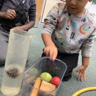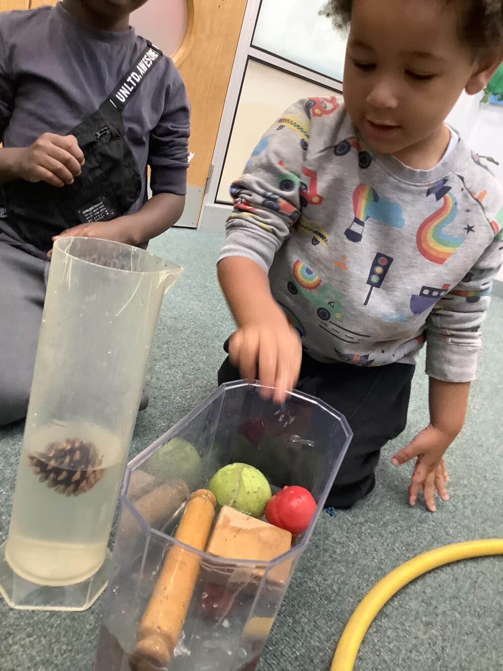 Treasure Chest Sessions saw children making predictions from a selection of items…which ones will sink and which ones will float? Hoops were used to sort the gathered items into sinker and floater piles. Lots of fun was had; a chance to think, talk and listen before getting on with the wet part!