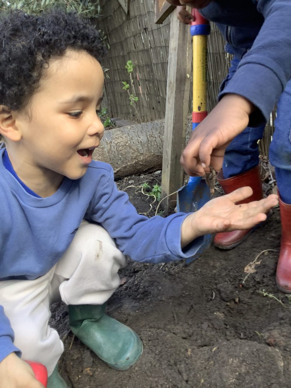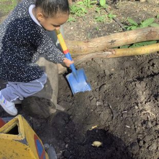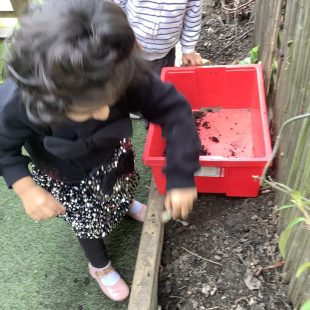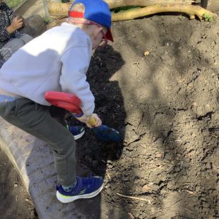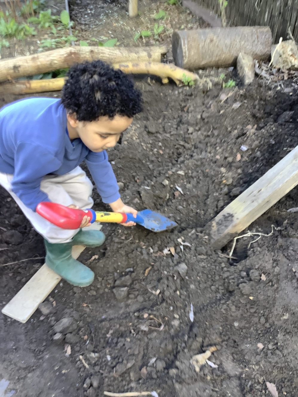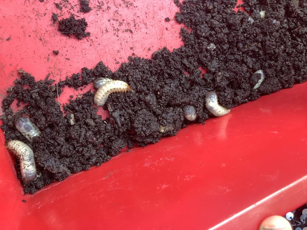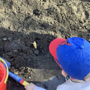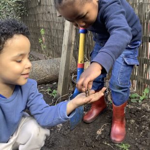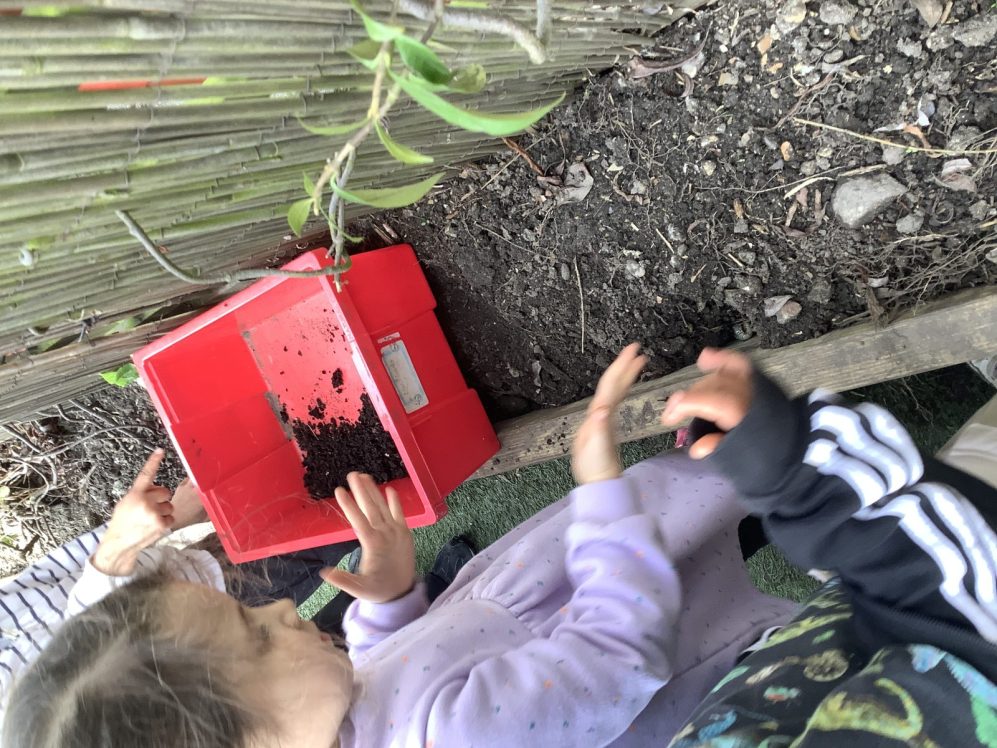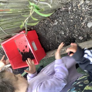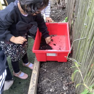 23 chafer beetle grubs were discovered in our compost bin. The children were fascinated as they handled them gently before rehousing them in a planter away from our seedlings.  Their wriggling, translucent bodies and sharp looking mouth parts left many unnerved, whilst others were delighted to see so many baby creatures in our garden. We learnt some mums do not look after their young, laying eggs and leaving their offspring to fend for themselves…luckily we were on hand to save them from our busy soil scooping!