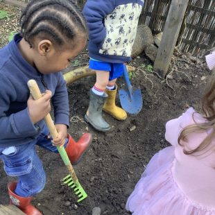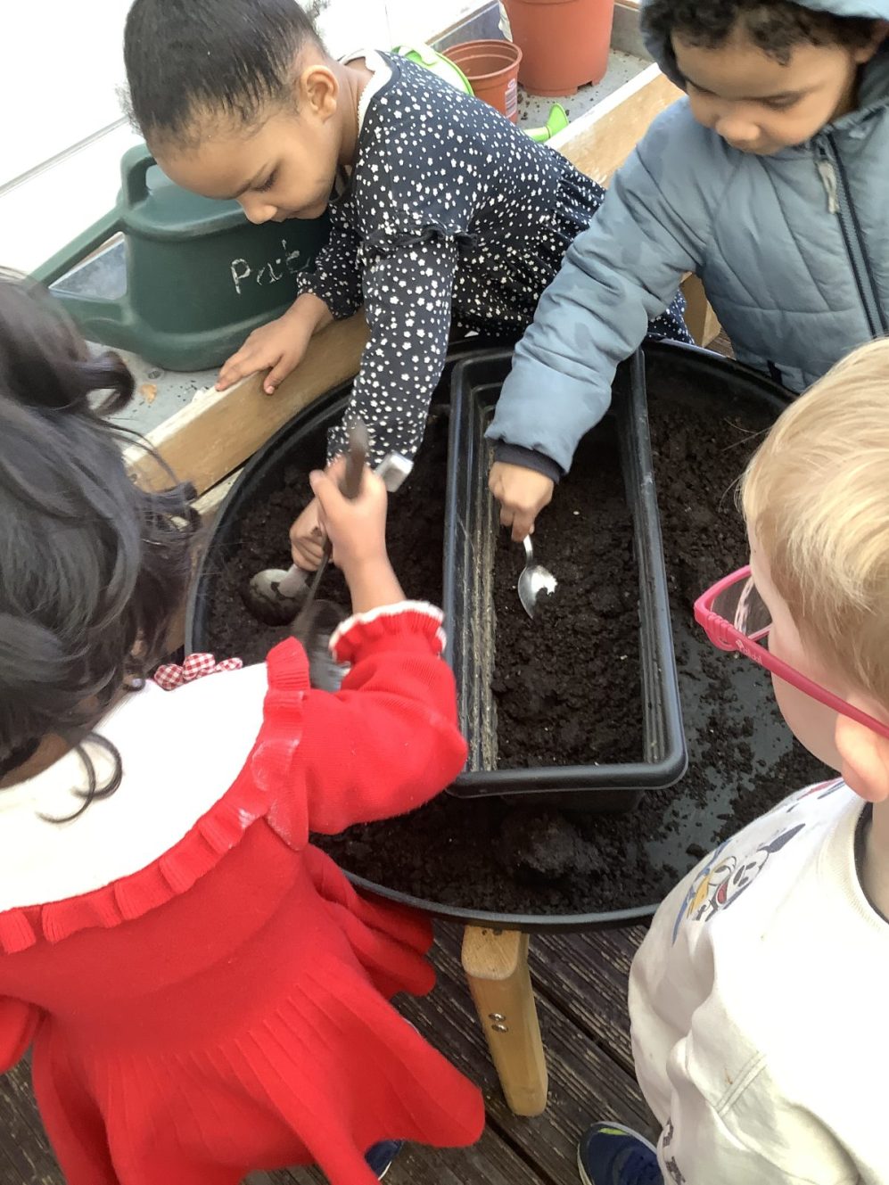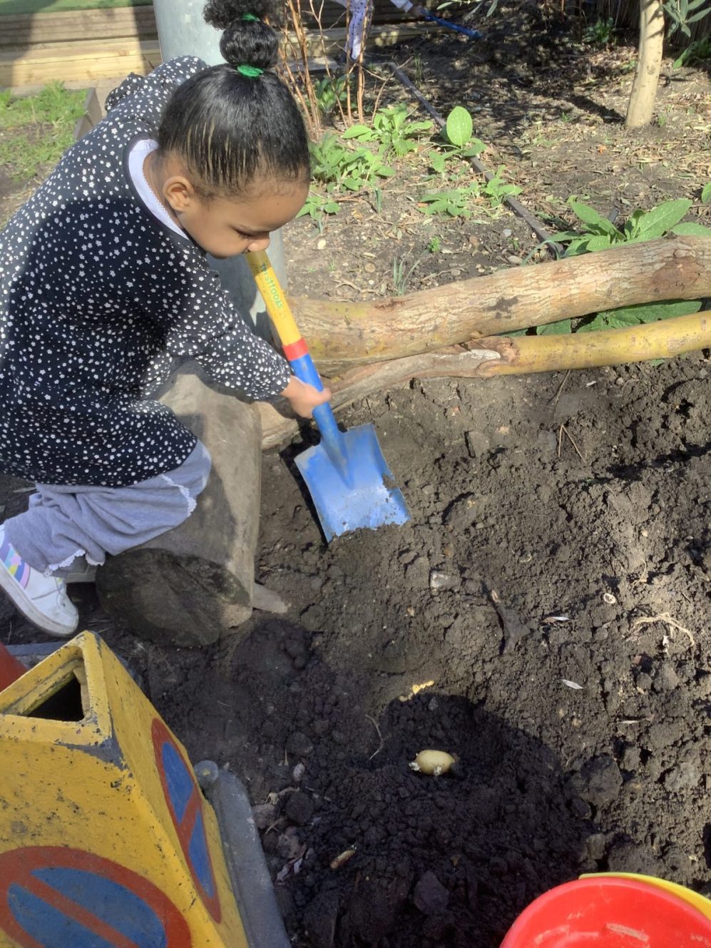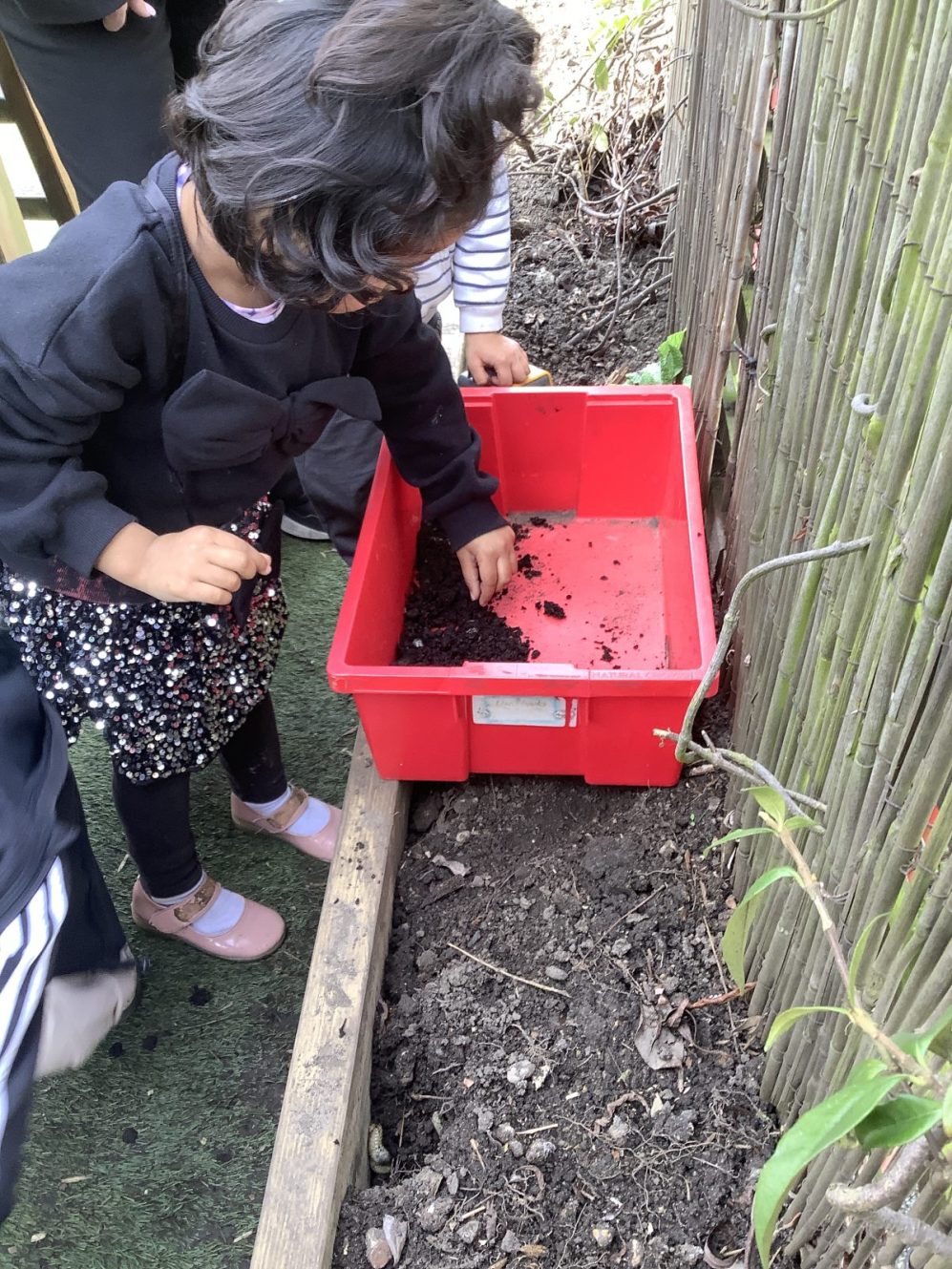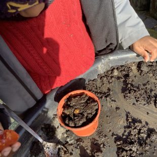 23 chafer beetle grubs were discovered in our compost bin. The children were fascinated as they handled them gently before rehousing them in a planter away from our seedlings.  Their wriggling, translucent bodies and sharp looking mouth parts left many unnerved, whilst others were delighted to see so many baby creatures in our garden. We learnt some mums do not look after their young, laying eggs and leaving their offspring to fend for themselves…luckily we were on hand to save them from our busy soil scooping!