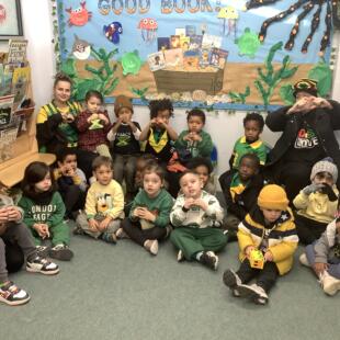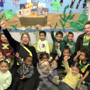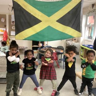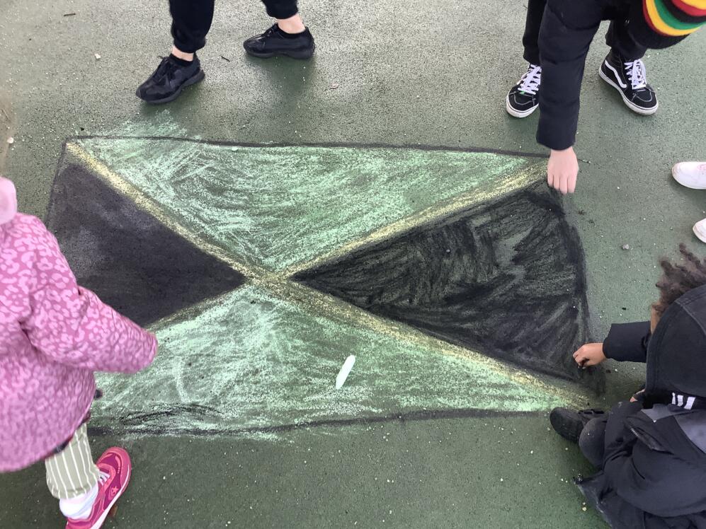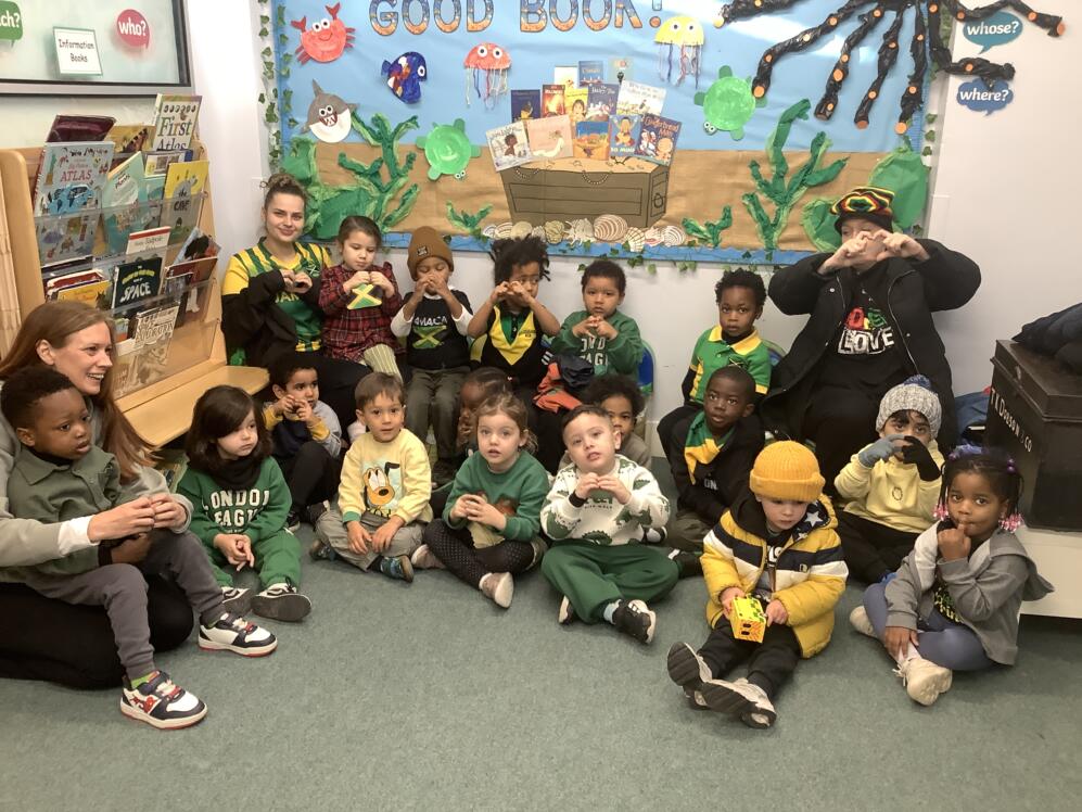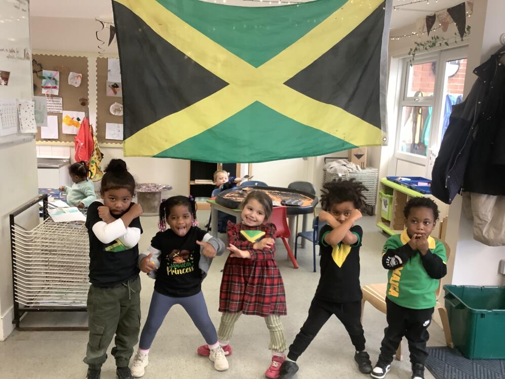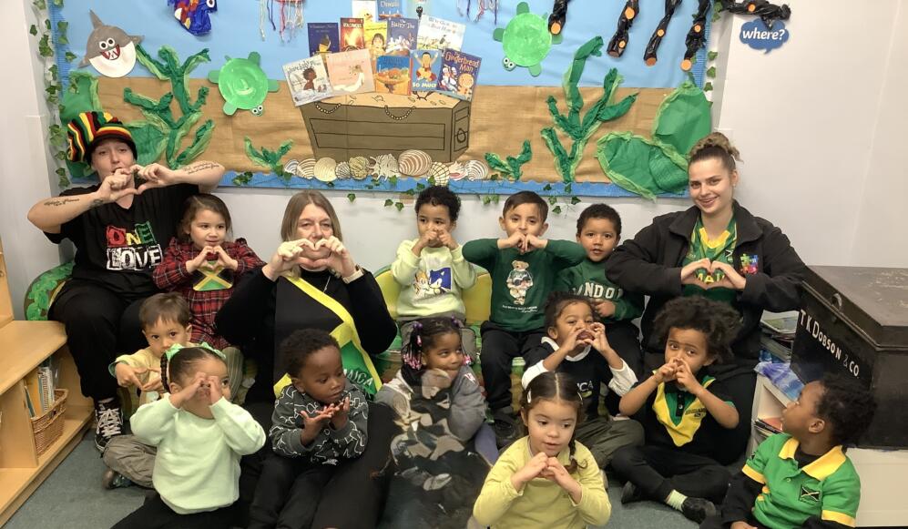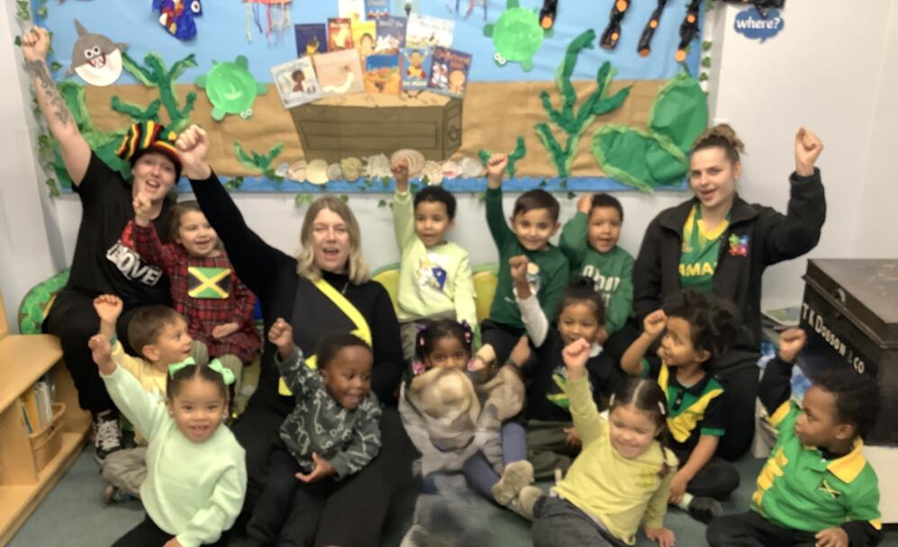 Today, the children, staff and families at Thornton Heath Nursery School showed wonderful solidarity and kindness. Everyone was invited to wear the colours of the Jamaican flag and make a donation towards the borough-wide fundraising effort. The nursery was filled with the uplifting sounds of Caribbean music, and the children enjoyed using their mark-making skills to create large Jamaican flags in our outdoor learning area.