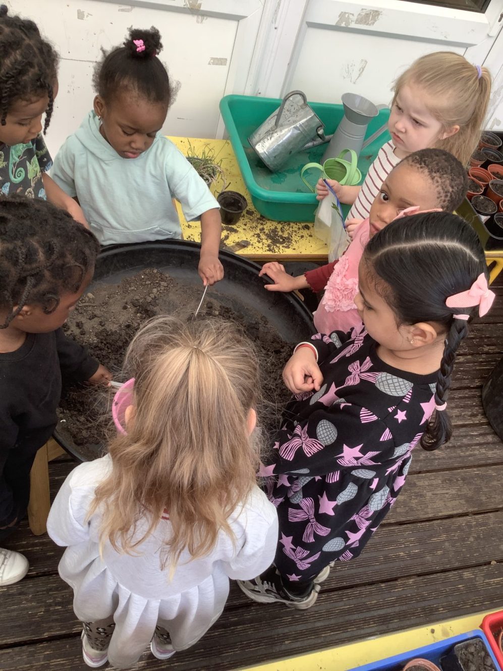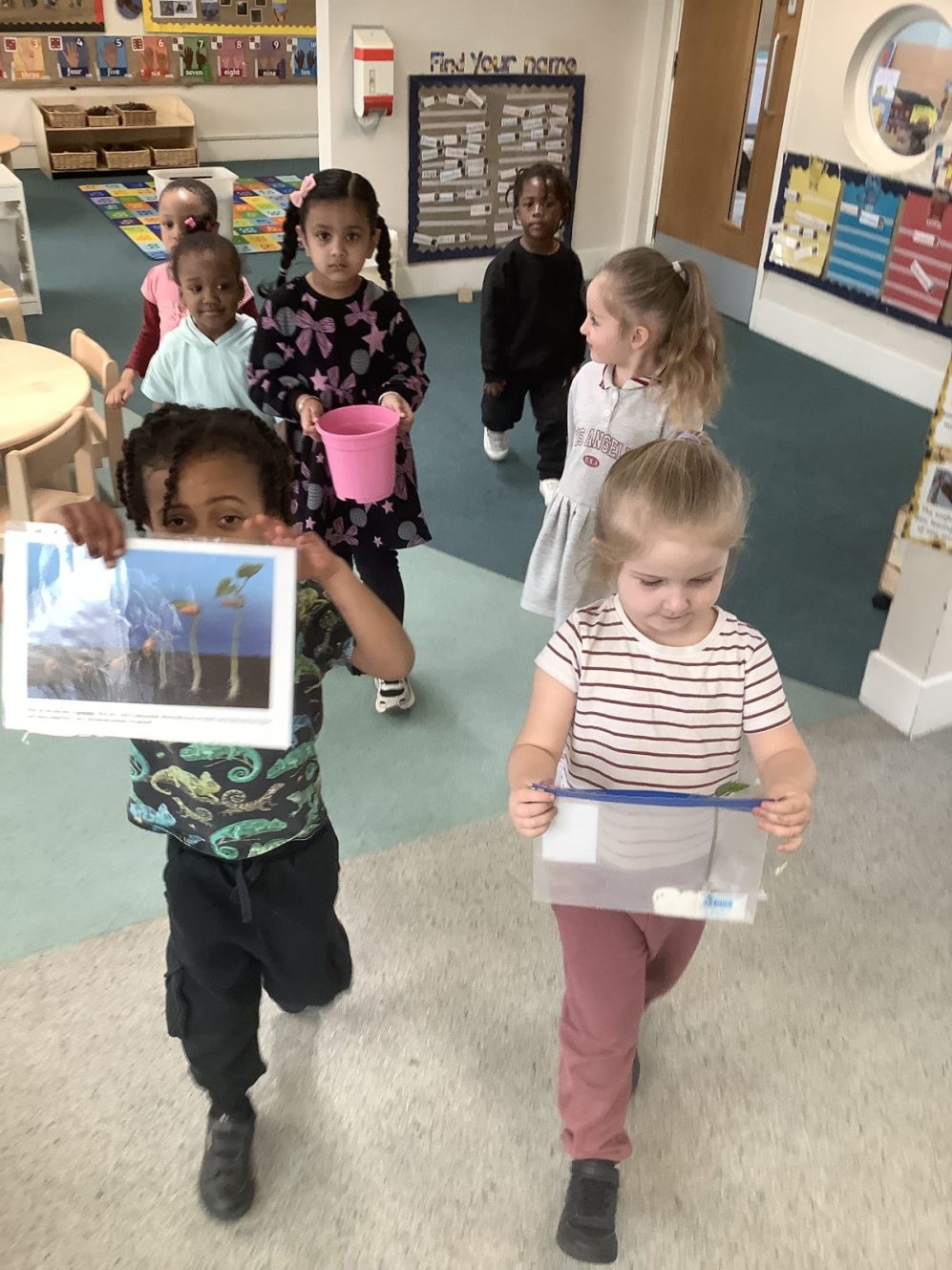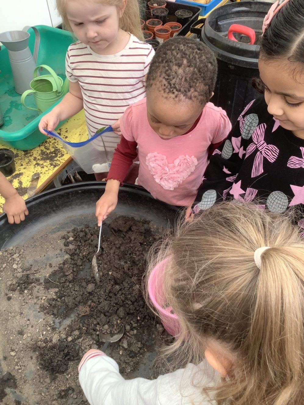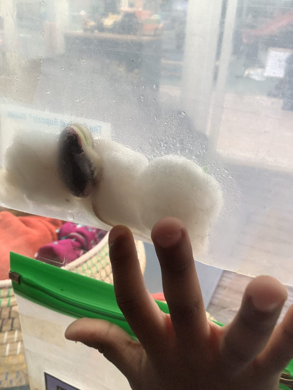 Last week, each group was tasked with wrapping a runner bean in wet cotton wool and placing it inside a transparent bag. Next, the bean had to be placed where the children believed it would germinate first. We had to ask many questions…do seeds germinate in the cold or the warmth? Do they need light or darkness? Can a bean germinate without soil? Karen’s group’s bean was placed next to an inside window…lots of light and lots of warmth. Other groups’ beans were placed by external windows…lots of light but not so warm….many of those have not germinated, let alone grown too big for their bags. Karen’s group’s bean is now a plant and safely potted in soil ready to grow big and strong before being planted outside.