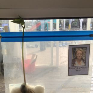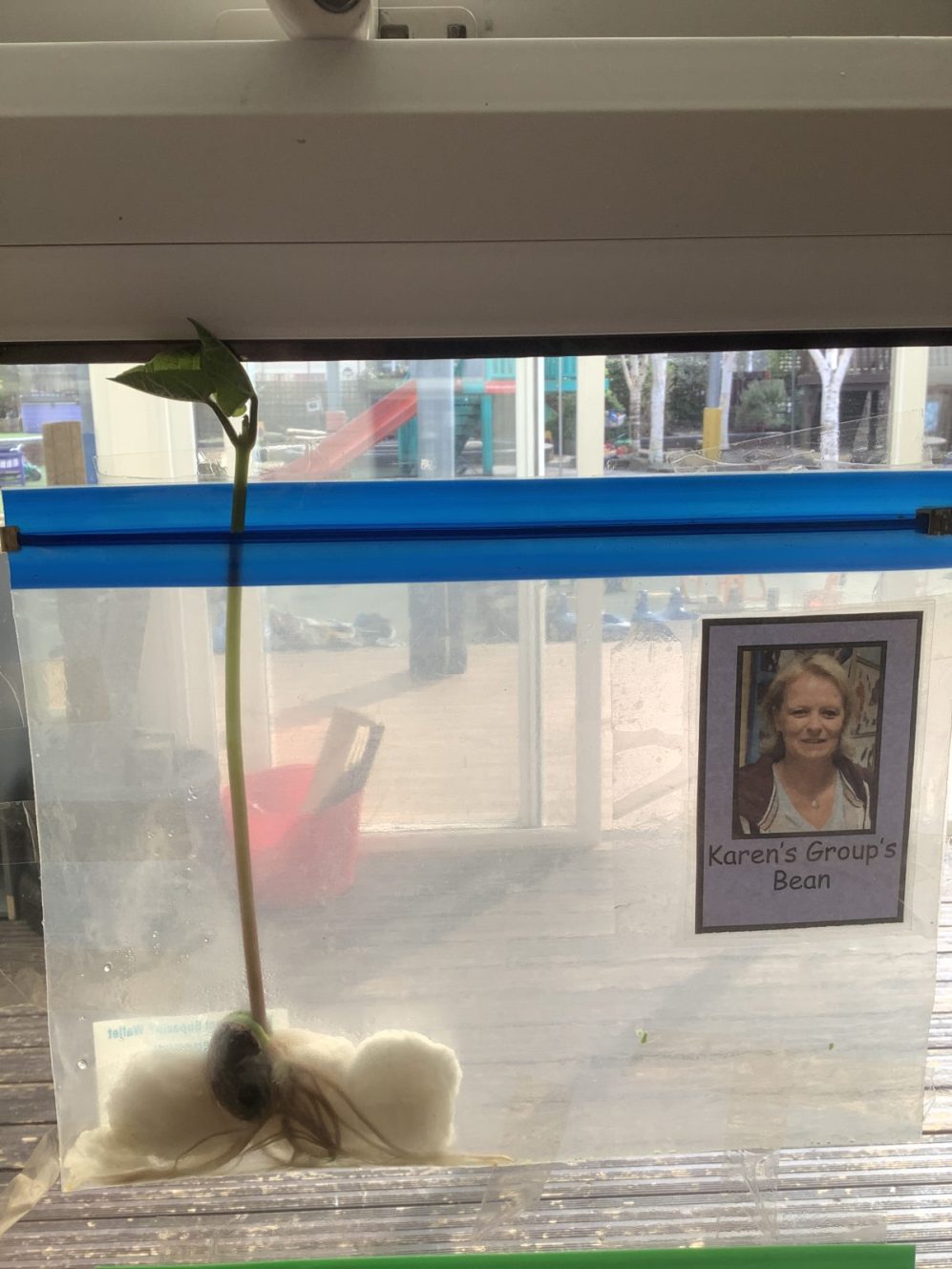 Karen’s group emerged triumphant this week as one of their beans became the first in the school to not only germinate but grow too big for the bag in which it was held!